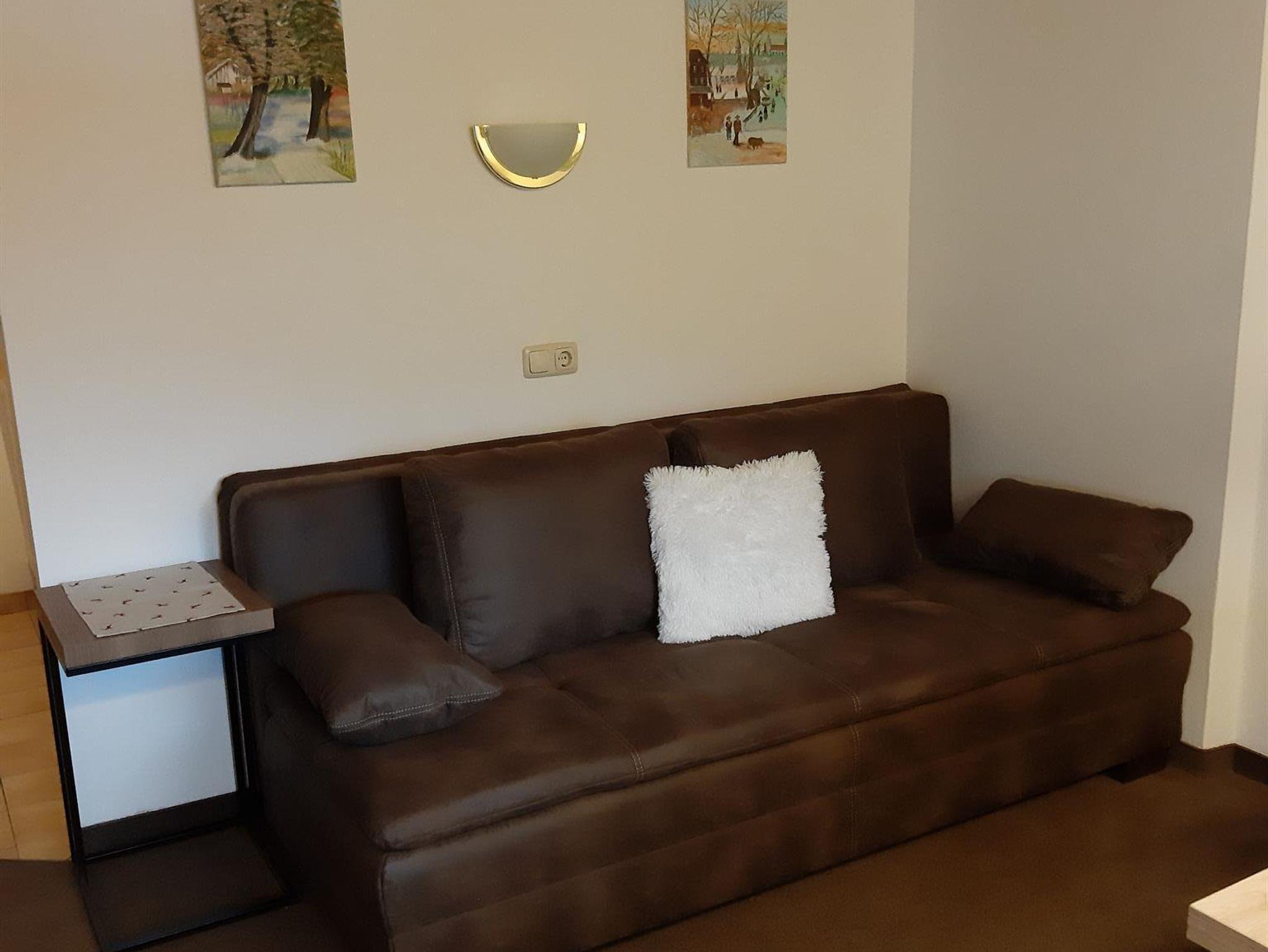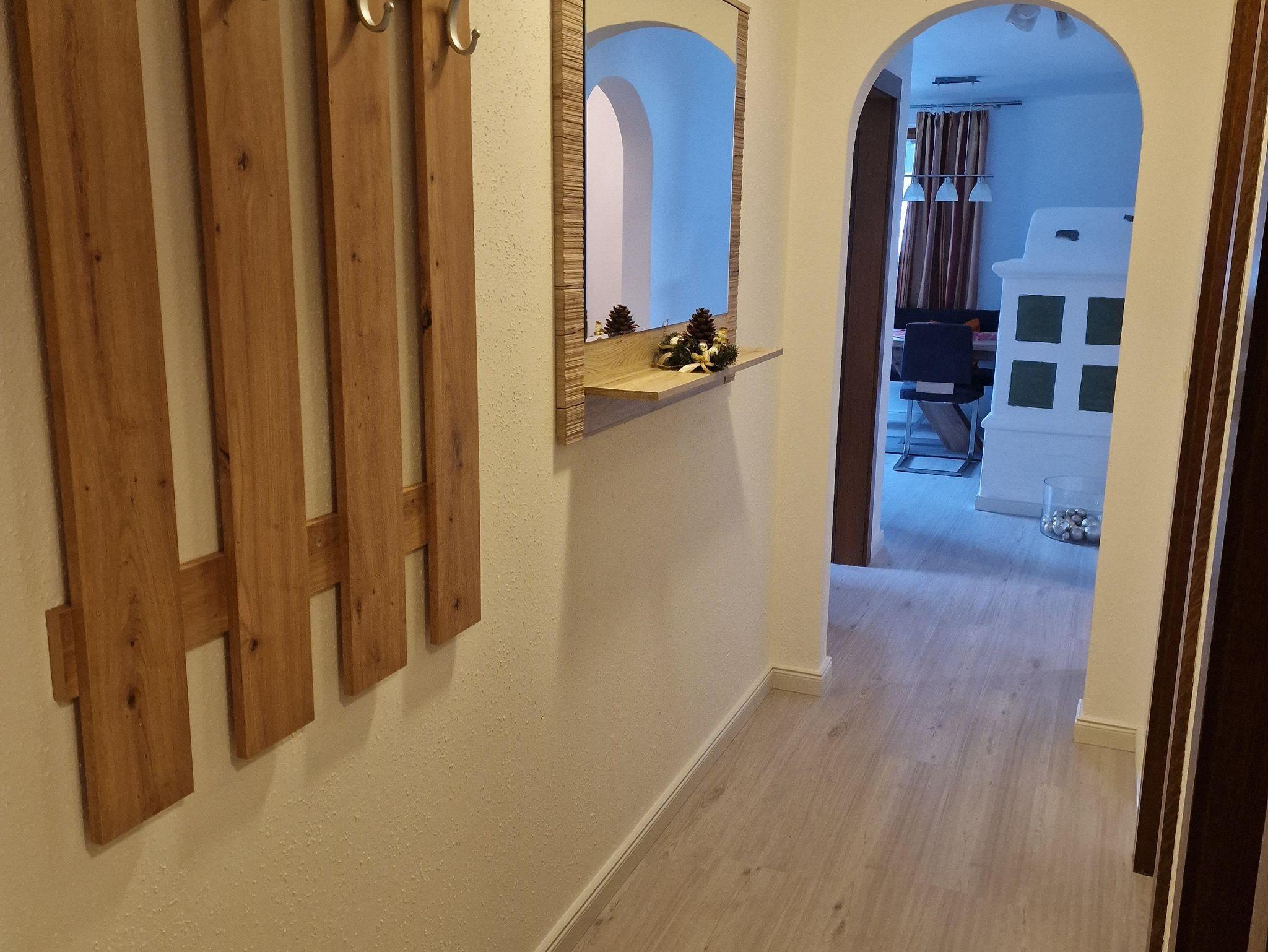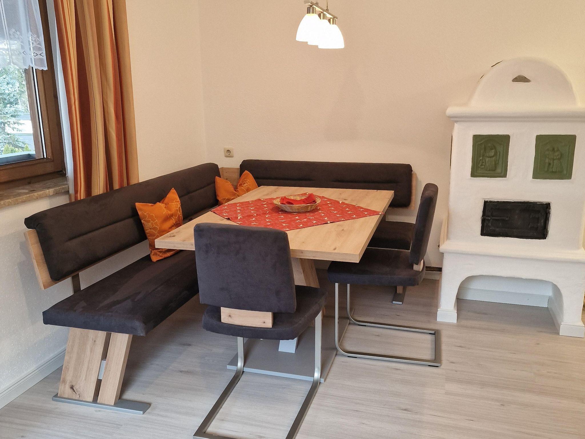 Die Ferienwohnung ((ca. 70 m2) mit zwei Schlafzimmern, einem Wohnschlafraum mit Kachelofen und ausziehbarer Couch, Sitzecke, Kochnische, getrenntes Bad/WC, Balkon oder Terrasse, Kabel-TV, Radio, gebührenfreier Internetanschluss.