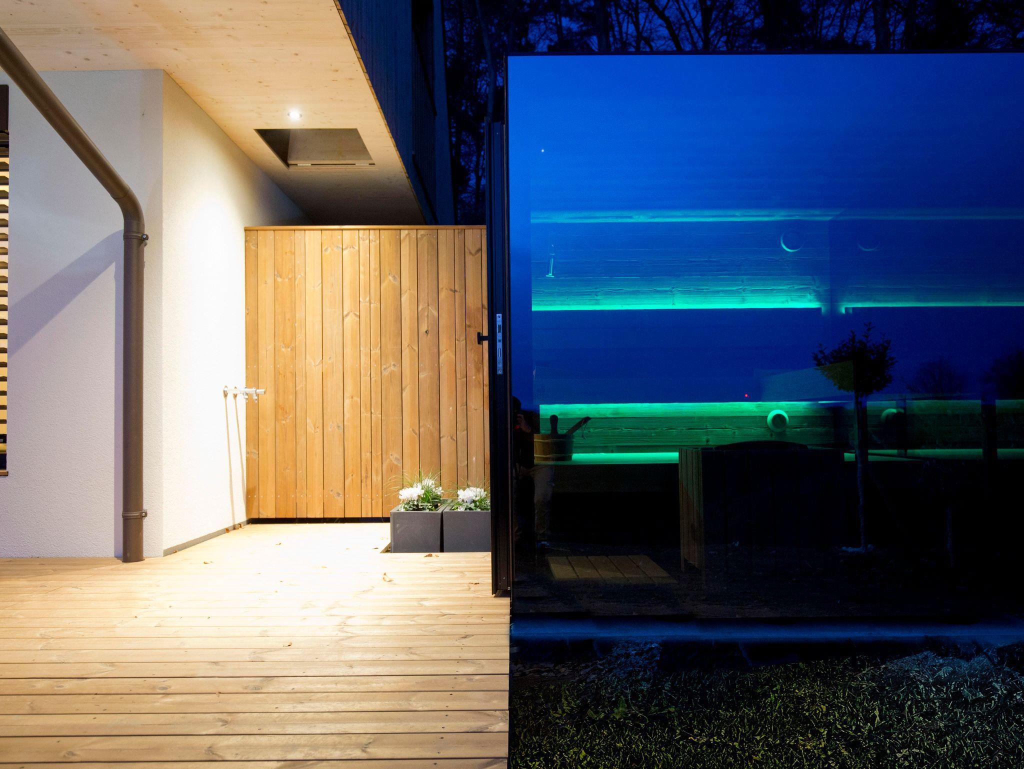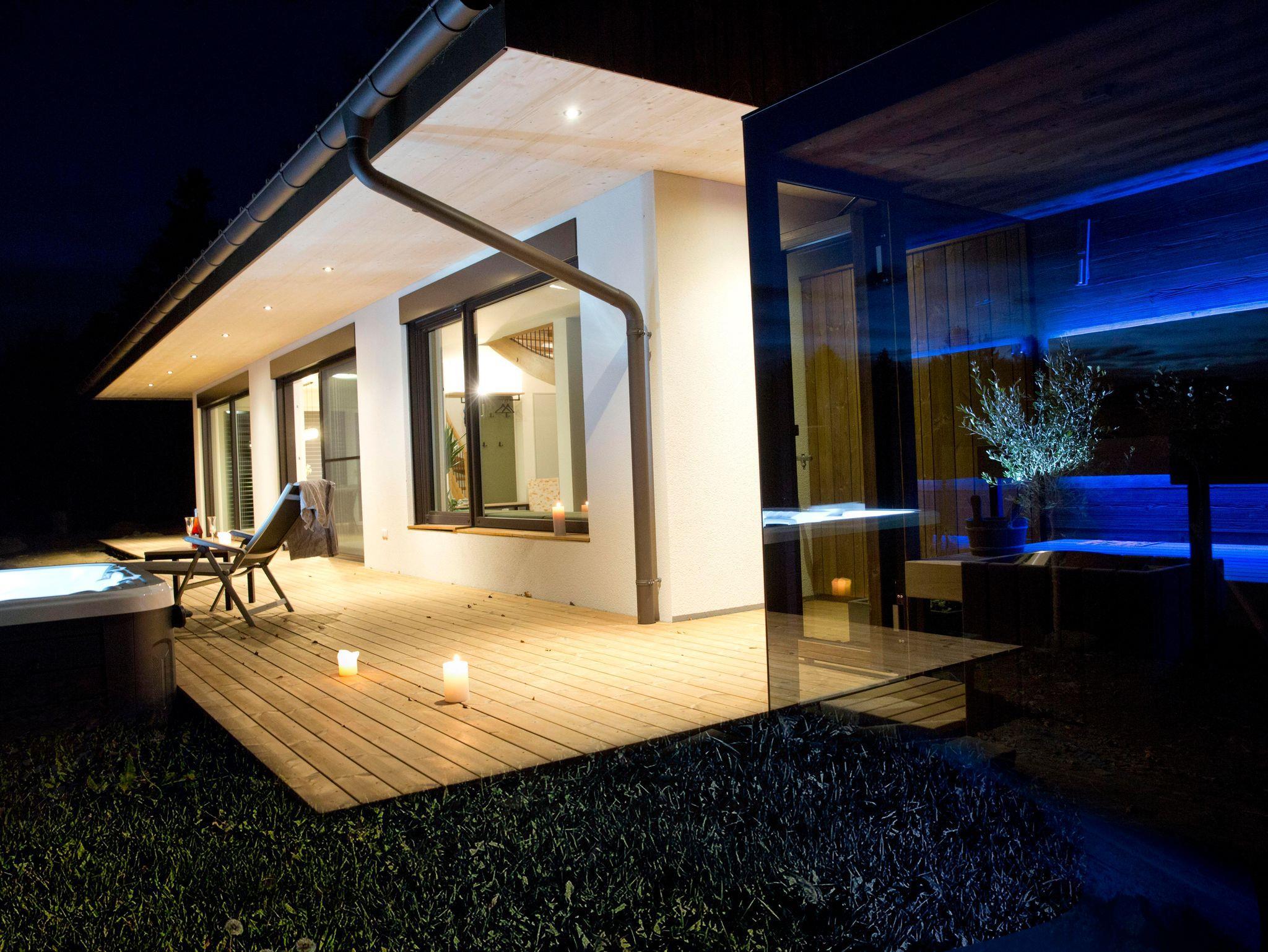 Auf der Holzterrasse können Sie die Sonne den ganzen Tag über genießen, sich im privaten Whirlpool entspannen oder in der stilvollen Spiegelsauna den Abend ausklingen lassen.