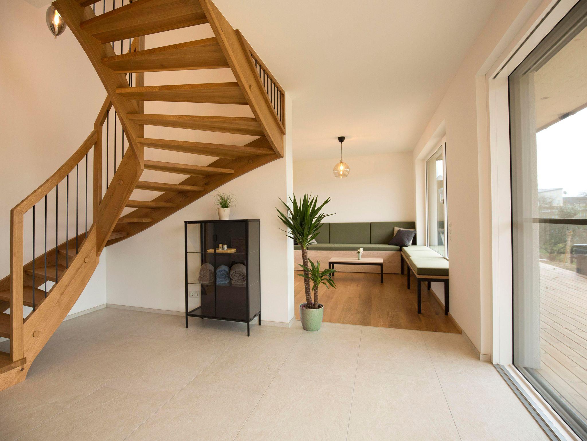 Das großzügige Erdgeschoss, das teilweise barrierefrei gestaltet ist, beeindruckt mit einer voll ausgestatteten Tischlerküche und einem gemütlichen Wohnbereich mit Schlafcouch. Großflächige Glasfronten ermöglichen einen ungehinderten Blick in die Natur und schaffen eine helle, offene Atmosphäre. Das Interieur aus heimischer Eiche, ergänzt durch elegante Schwarzstahl-Akzente, verleiht dem Raum eine warme und einladende Note.