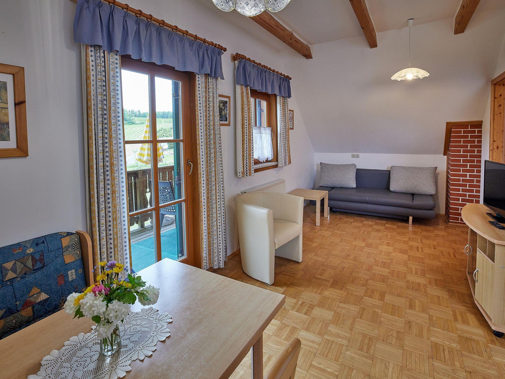 Von dieser Ferienwohnung haben Sie in Richtung Süd - Osten den Überblick auf unseren gesamten Bauernhof. Die Ferienwohnung hat eine Größe von 46 m², wo sich 2 bis 3 Personen wohlfühlen können. Vom Vorraum aus geht es in Küche, in den Wohn - Essraum, in das Bad, in das WC und in 2 Schlafzimmer. Ein großer Balkon mit Gartengarnitur und Liegestühlen lädt zum privaten und ungestörten Verweilen ein.