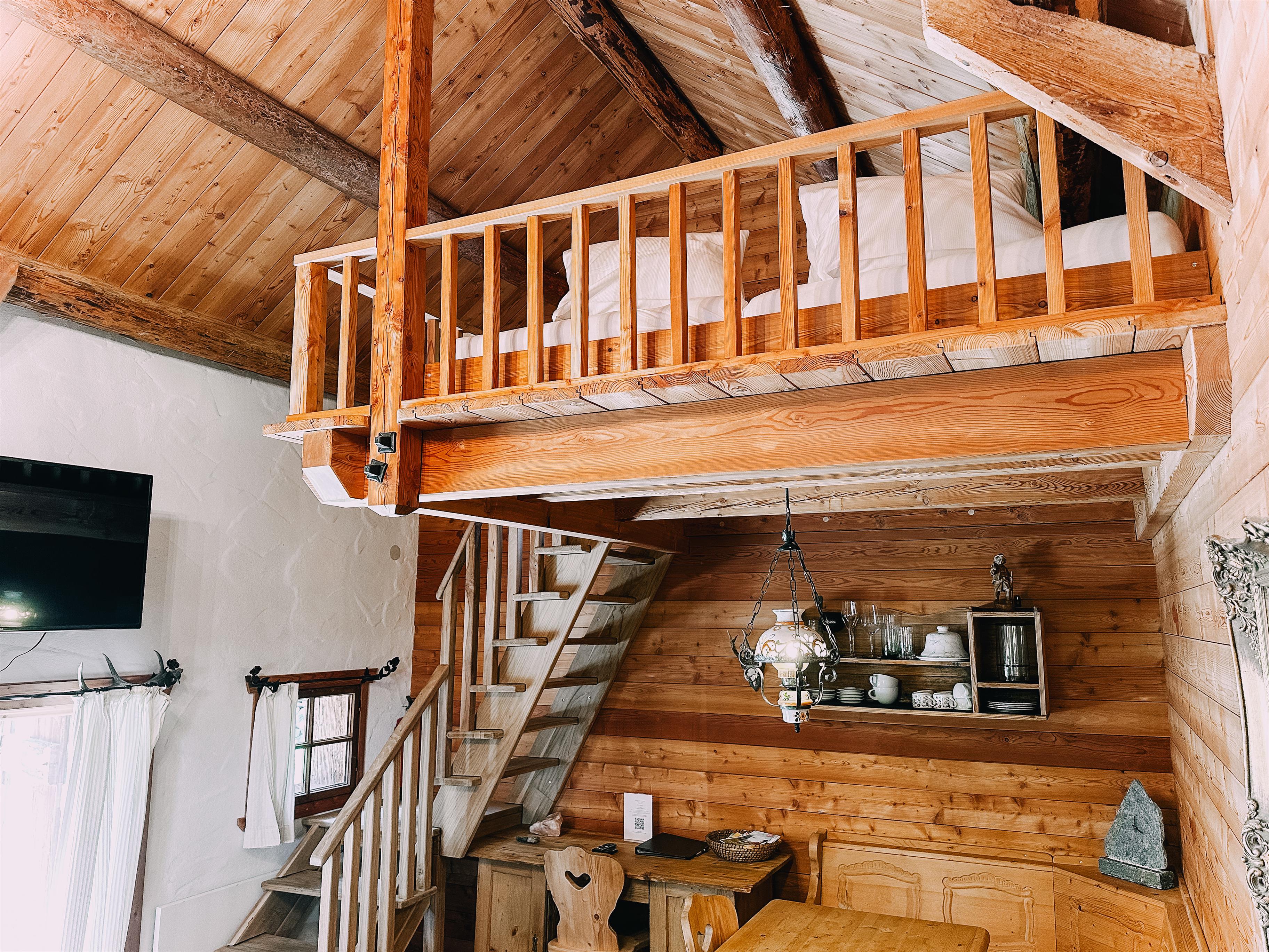 Das Highlight ist der uralte geschmiedete Herd, der von einer Alm am Großglockner stammt. Selbstverständlich gibt es alternativ auch eine Induktions-Kochplatte und eine elektrische Bratpfanne für diejenigen, denen es am heimeligen Herd zu heiss wird. Kühlschrank, Spüle, natürlich auch Ess,- und Kochgeschirr sind vollständig vorhanden. Geschlafen wird in der Galerie unterm Dach.