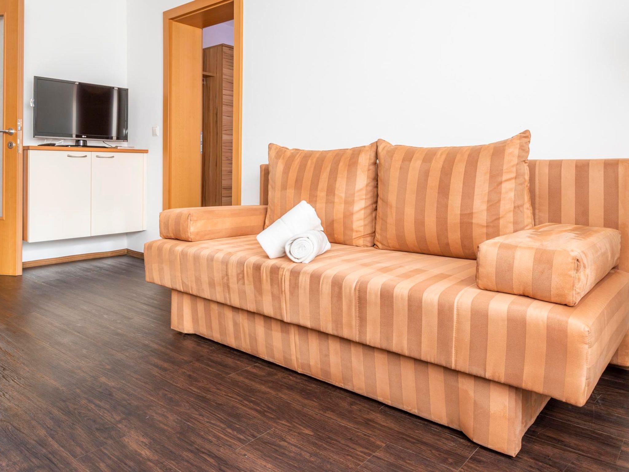Appartement: Große, neu,e voll ausgestattete Küche mit Essecke und großer Couch, SAT-TV, W-LAN Anschluß. Zimmer: Sind alle vom Wohnbereich getrennt, je 1 Fenster, Holzmöbel, Wandschrank, Garderobe, Wandspiegel, Tisch u. Stuhl, DU u. WC sind voneinander getrennt.