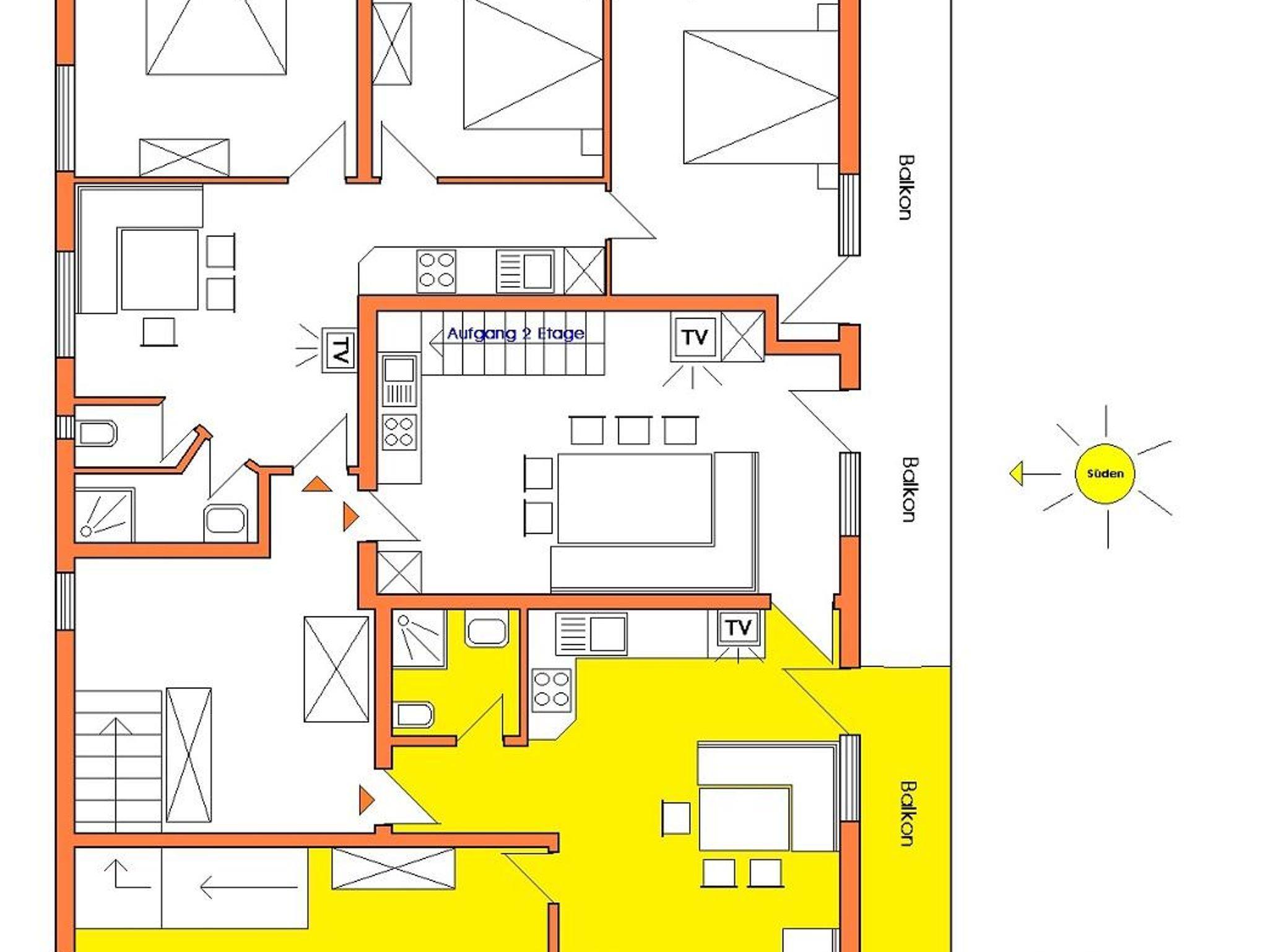 (48m2) 1 Schlafzimmer (DBZ) / 1 Wohnschlafraum (2 Betten), Elektroherd mit 4 Platten (Ceran), Backofen, Mikro, Kühlschrank, Kaffeemaschine, Toaster, Mixer, Wasserkocher, SAT-TV, 1 Dusche/WC, Wohnküche, Süd-Balkon