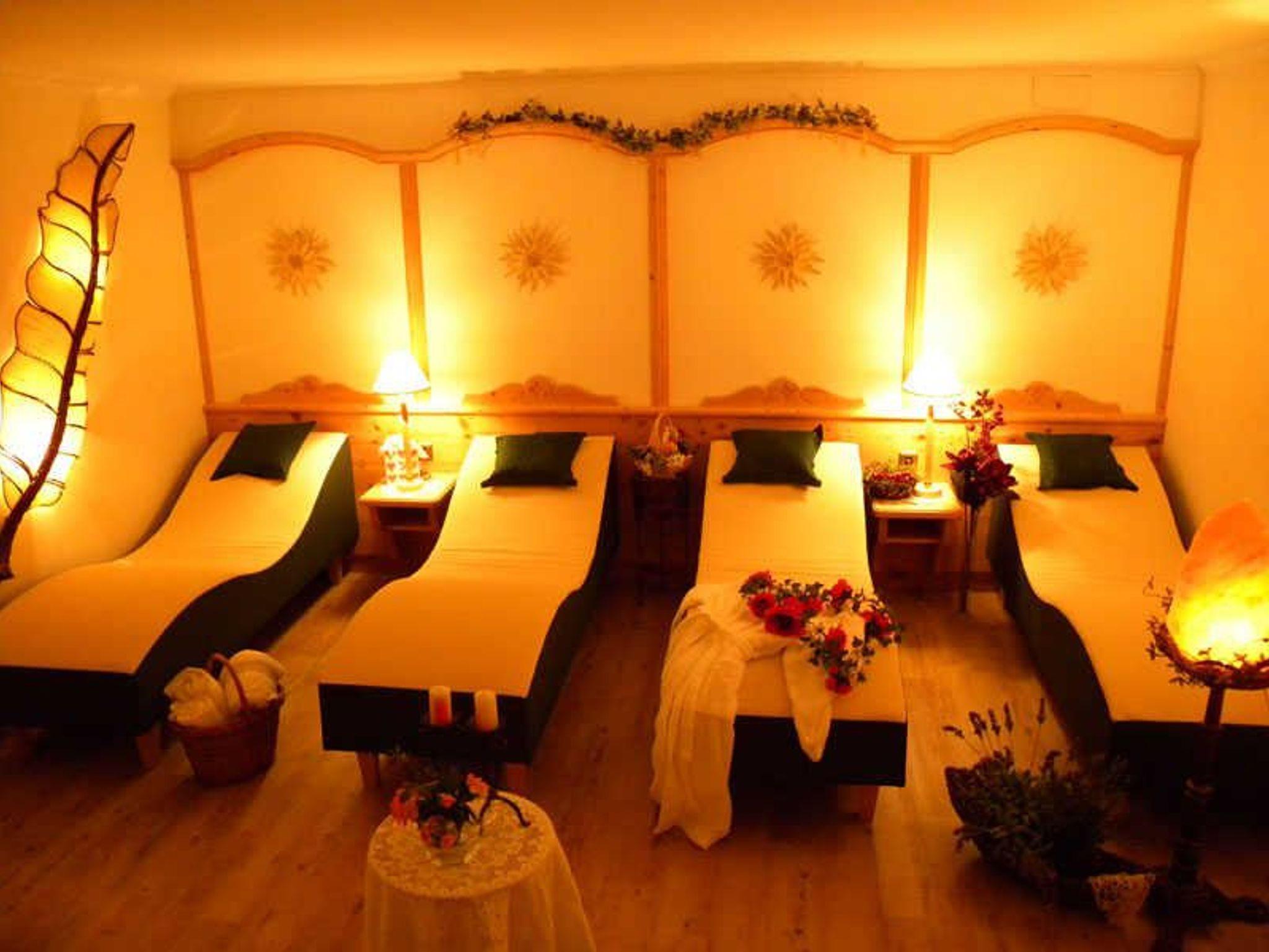 Personen im modernen Landhausstil, einem Wellnessbereich mit Sauna, Infrarotkabine und Dampfbad in