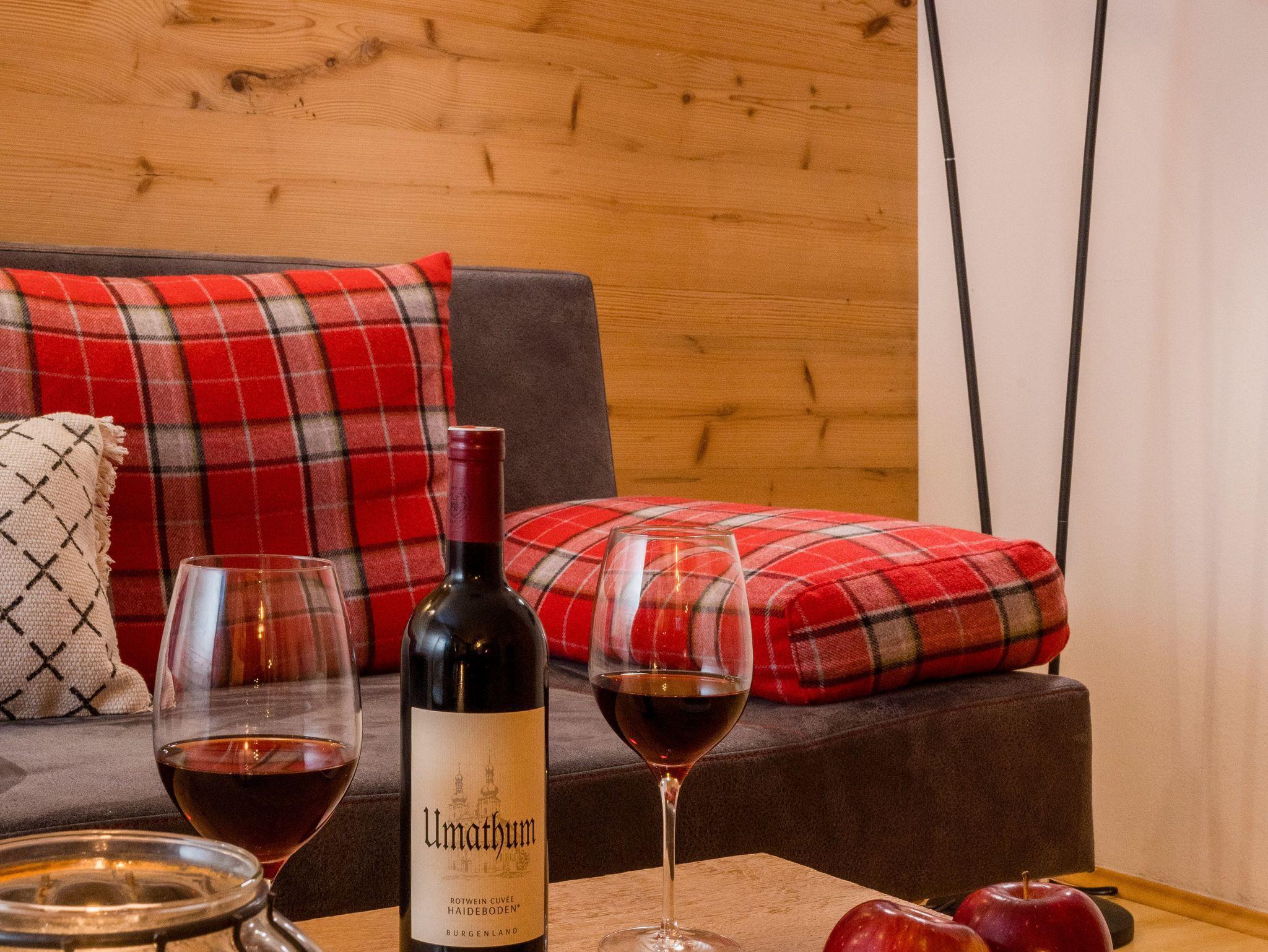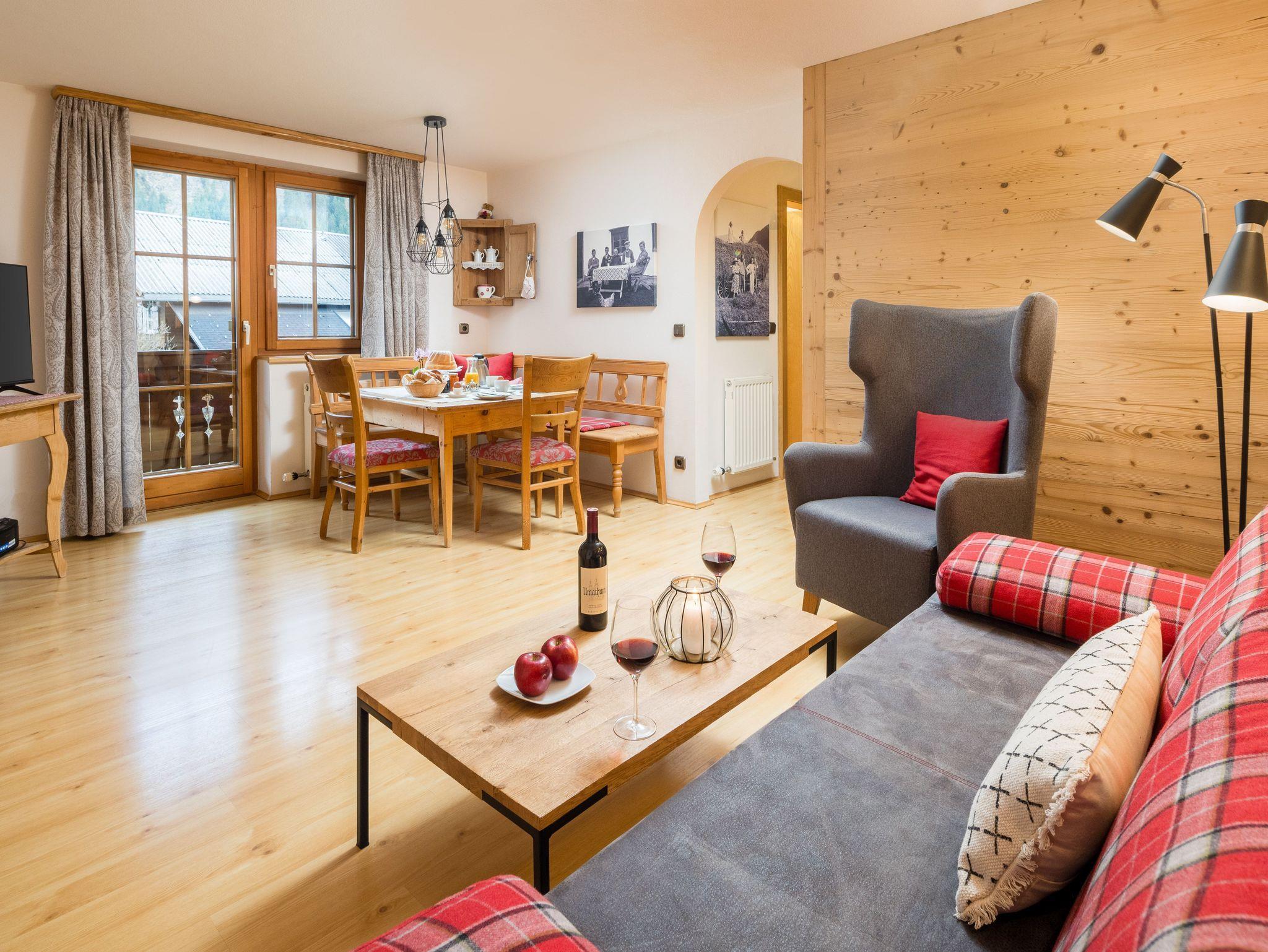 Der authentische Ess- und Wohnbereich bildet den natürlichen Mittelpunkt der Stube und versprüht jede Menge Wohlfühlatmosphäre. Die Wandgestaltung mit Kiefern- und Fichtenaltholz spendet schmeichelnd honigfarbenes Licht. In der Bauernstube zieren über naturbelassenen Altholztisch aus dem Ursprungshaus moderne Designlampen. Alte Schwarzweißfotografien erinnern an frühere Zeit im Bäckergut. Spannende Lektüre findet sich in der Hausbibliothek. Räumlich getrennt ist die perfekt eingerichtete Küche.