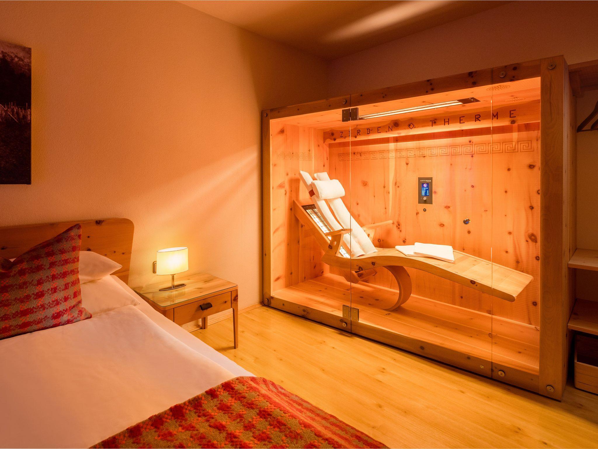 Erleben Sie Tiefenwärme und Zirbenduft in Ihrem persönlichen Spa. Infrarotwärme wirkt regenerierend, stärkt das Immunsystem und fördert innere Ruhe. Auf der ergonomischen Infrarotliege fühlen Sie sich schwerelos und entspannt. Die Regendusche belebt Körper und Geist.