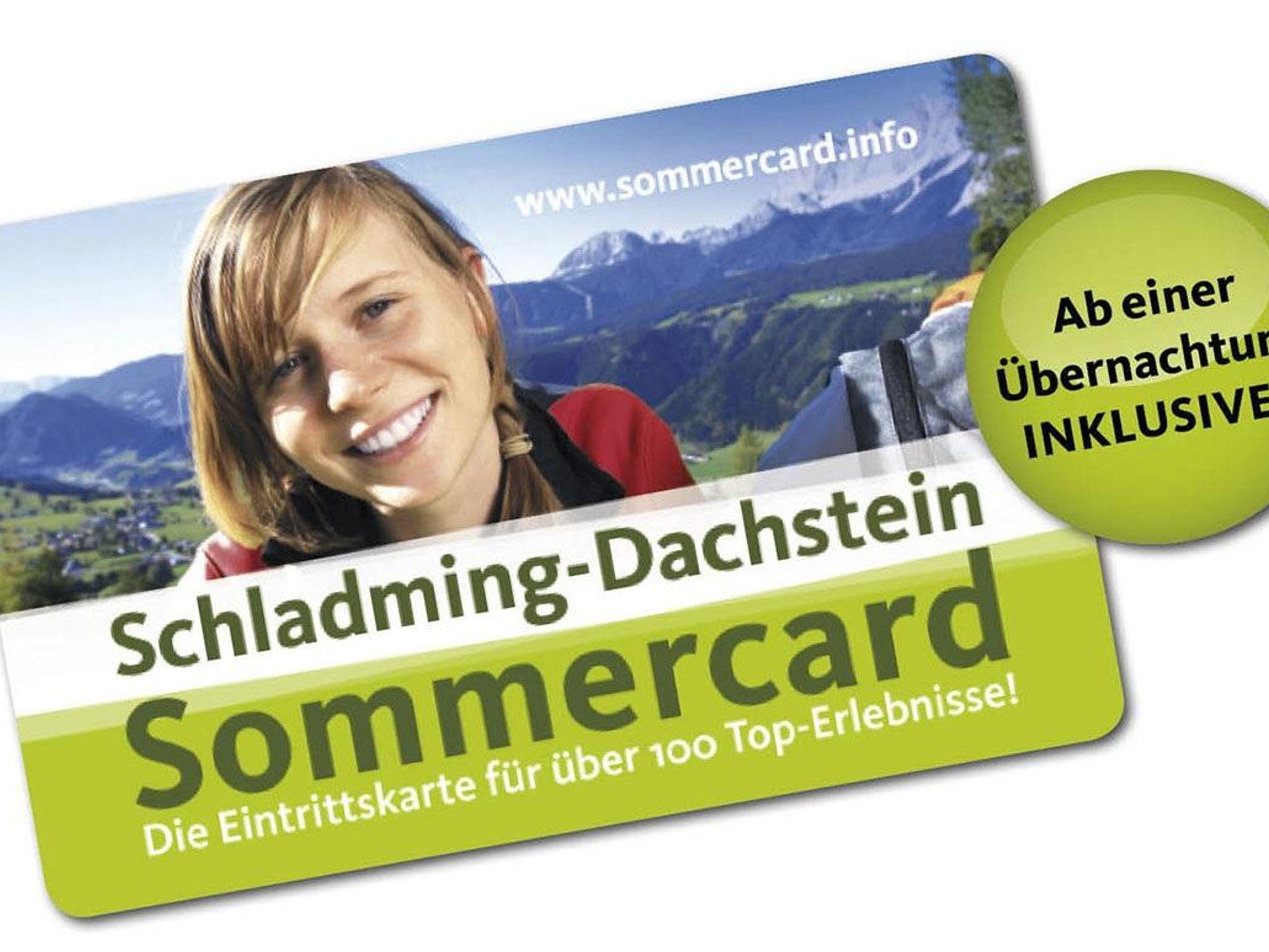 In den Sommermonaten erhalten Sie die Schladming-Dachstein-Sommercard kostenlos, wenn Sie im Appartement Panorama nächtigen. Mit dieser Karte können Sie unzählige Freizeitangebote wie zB Mautstraßen, Schwimmbäder, Badeseen, diverse Eintritte und Gondelfahrten auf die umliegenden Berge kostenlos in Anspruch nehmen. Für ein weiteres Abenteuer sorgt auch die Zipline Stoderzinken (ermäßigt mit der Sommercard).