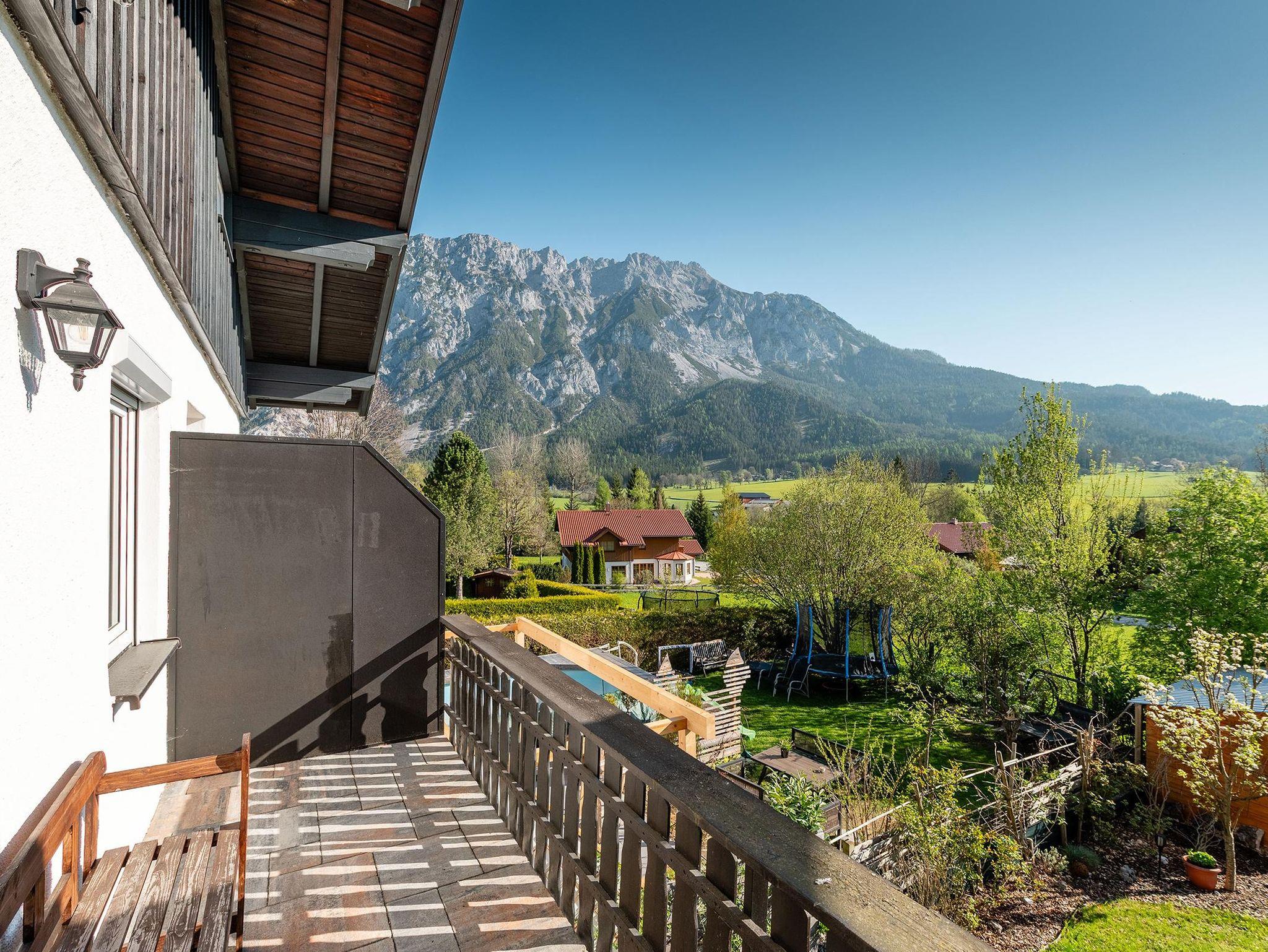 Die großzügige Terrasse mit Garten eröffnet Ihnen einen beeindruckenden Panoramablick über das gesamte Tal am Fuße des Stoderzinken. Genießen Sie die ruhige, ländliche Lage im Ortsteil Wink, entspannen Sie auf den Gartenmöbeln und lassen Sie die Seele baumeln.