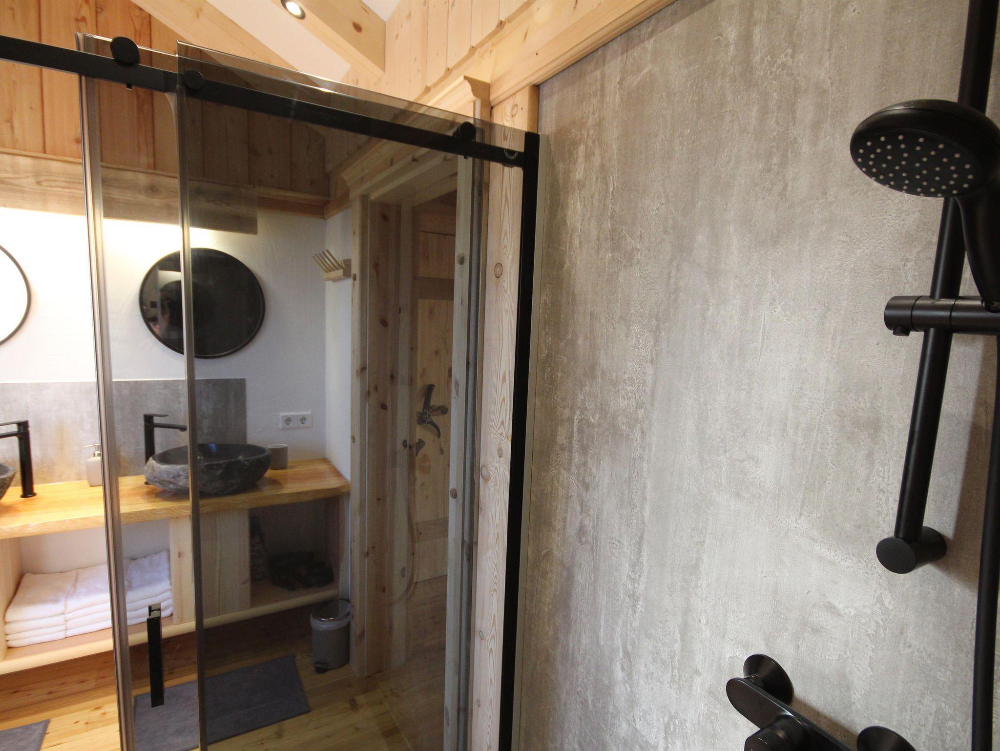 • Ein geräumiges Badezimmer mit Dusche und Waschtisch