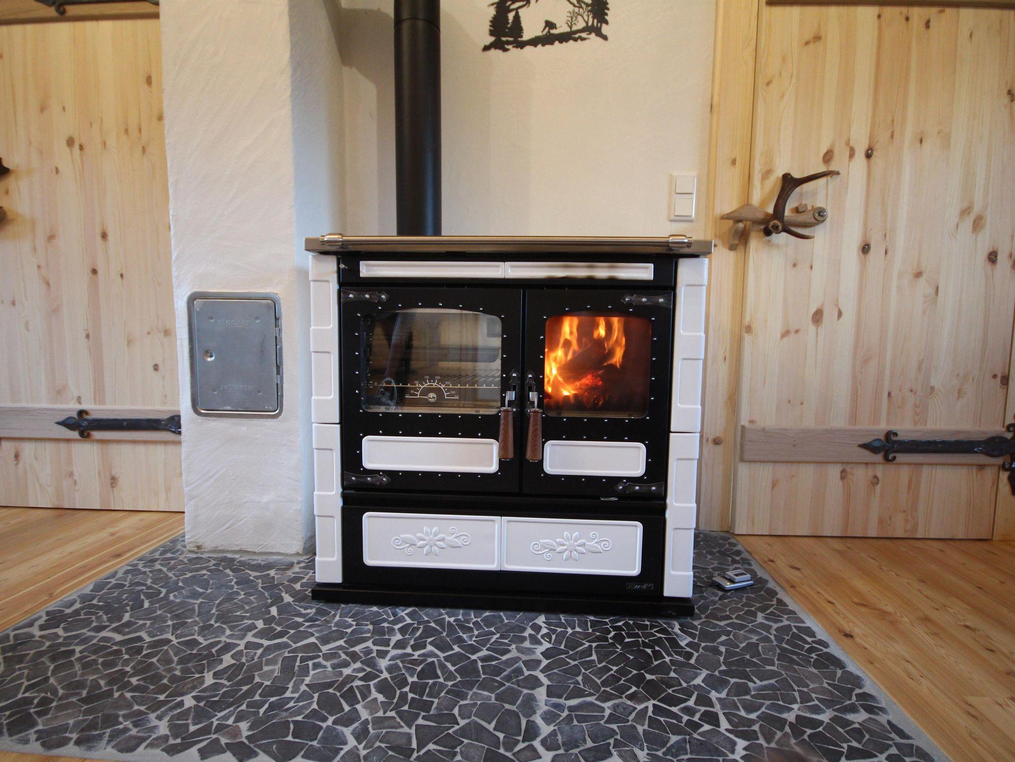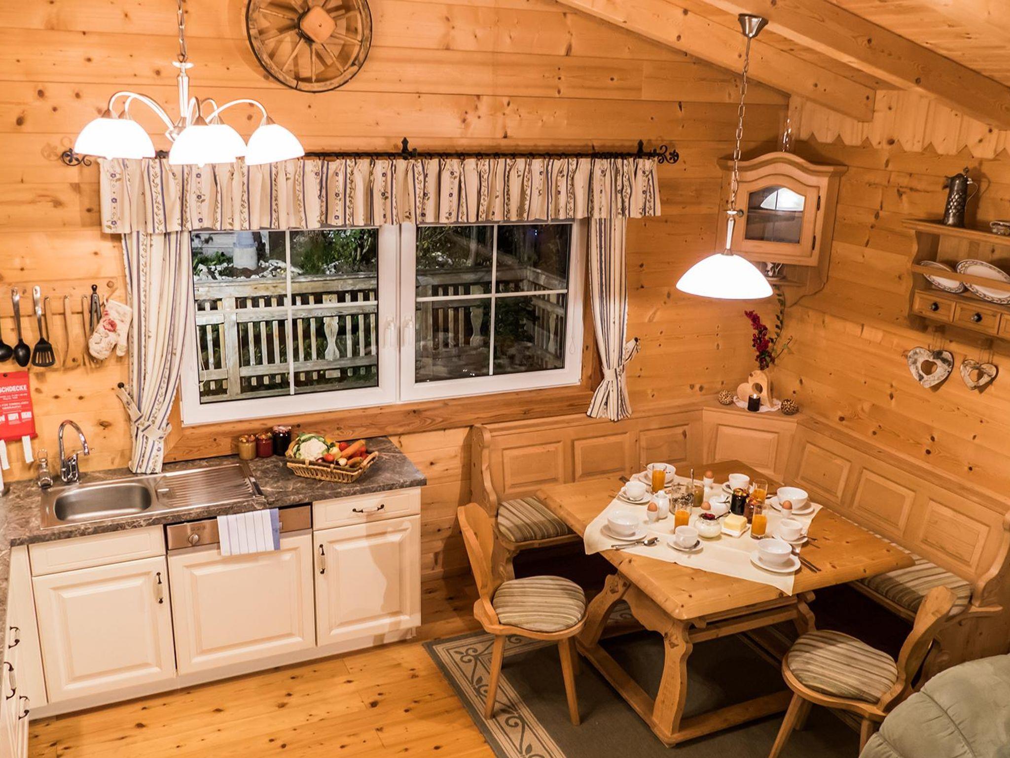• Voll eingerichtete offene Küche mit Sitzecke und großem Jogeltisch im Landhausstil