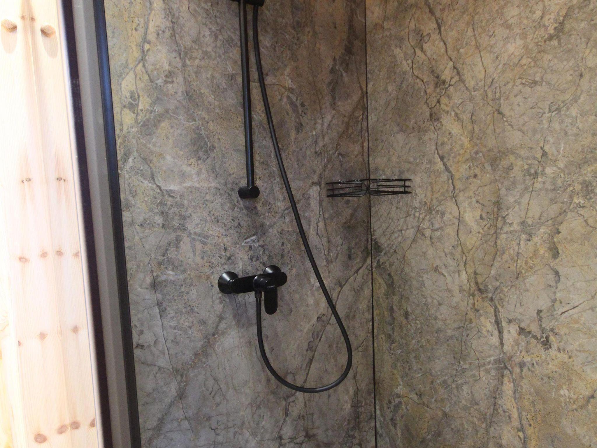 • Ein geräumiges Badezimmer mit Dusche und Waschtisch