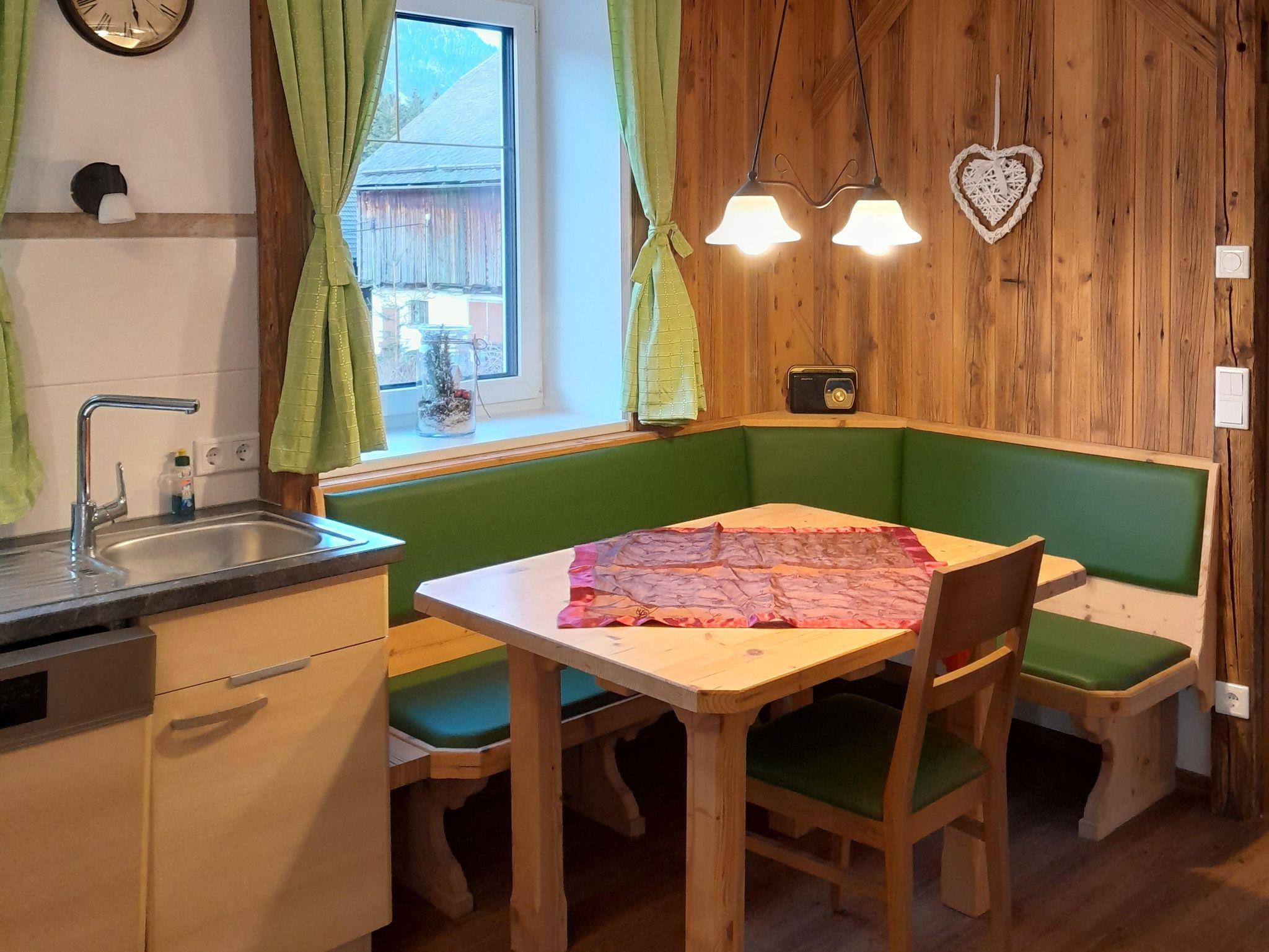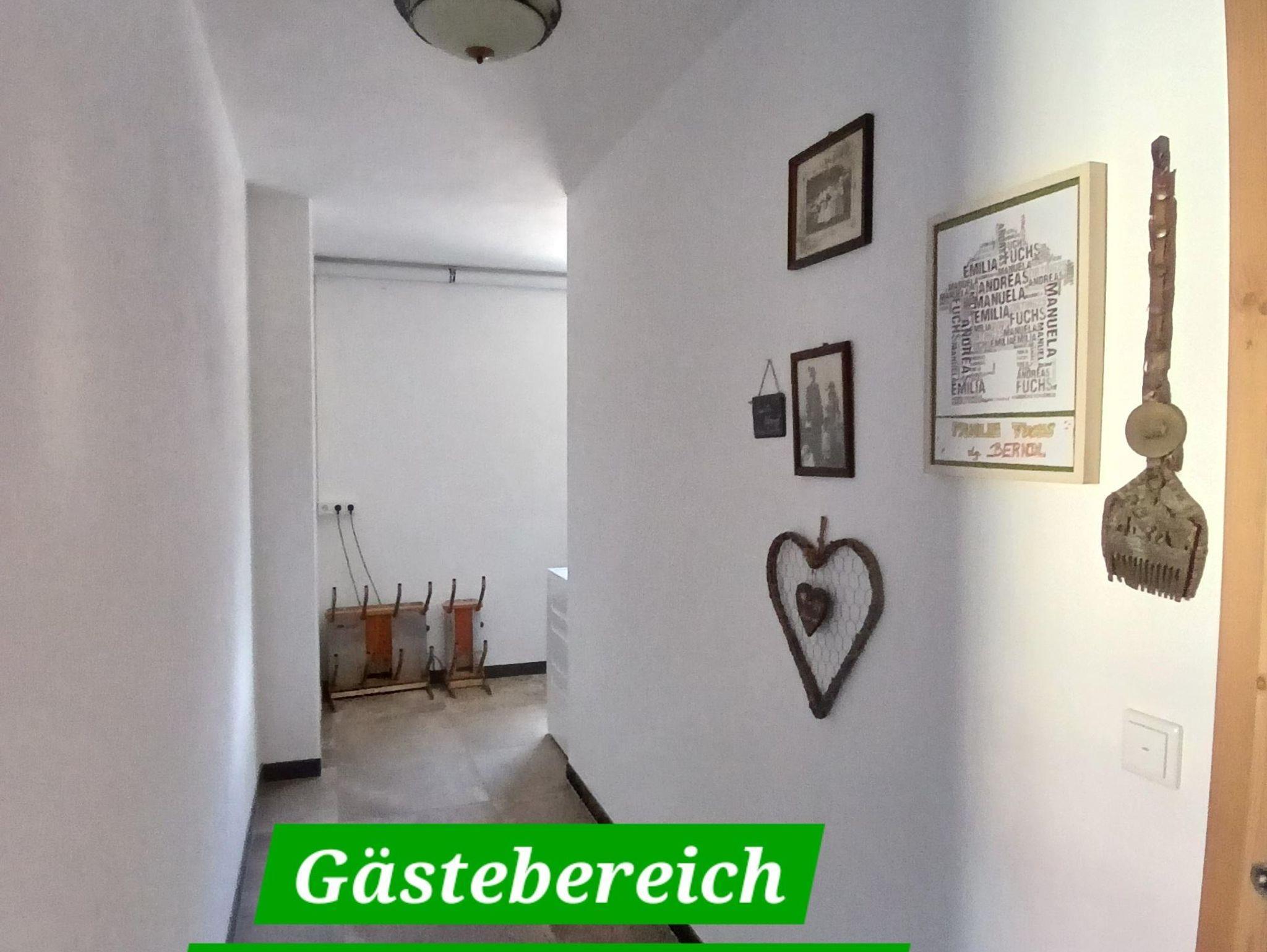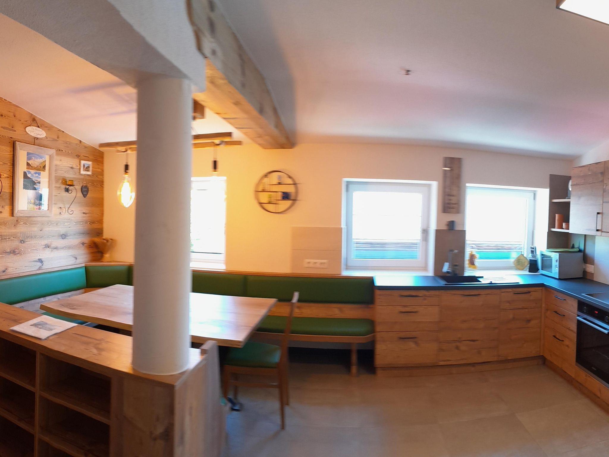 Küche mit uriger Eckbank und Tisch zum Sitzen für 10 Personen, Vorraum mit Garderobe und Liegecouch. Badezimmer mit Waschtisch, Badewanne und Dusche und ein extra begehbares WC. Ein Babybett kann auf Anfrage ebenso beigestellt werden.