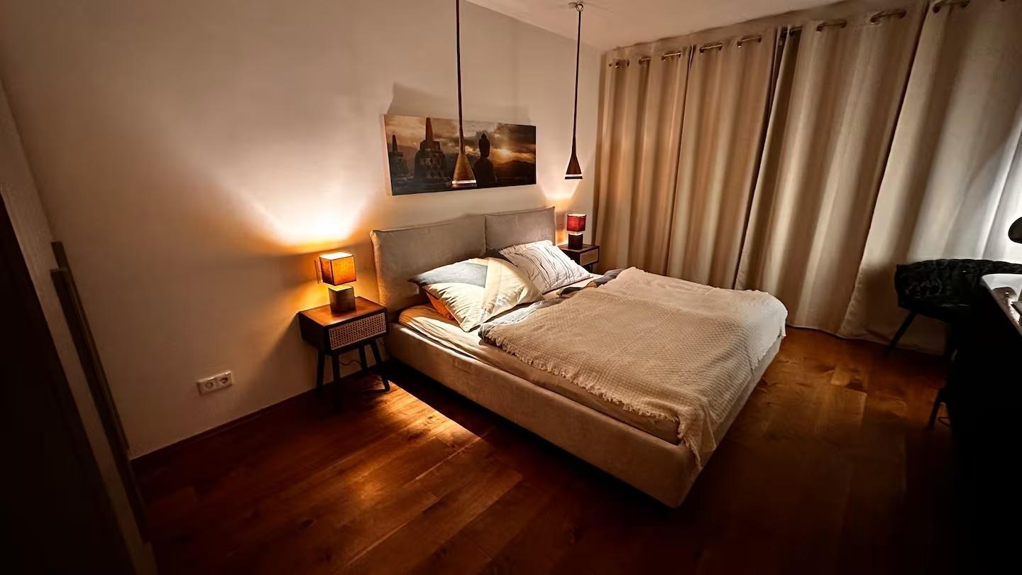 Angrenzend an das Wohnzimmer der erste Schlafbereich mit geräumigen Kleiderschrank und direktem Zugang zum Badezimmer.
