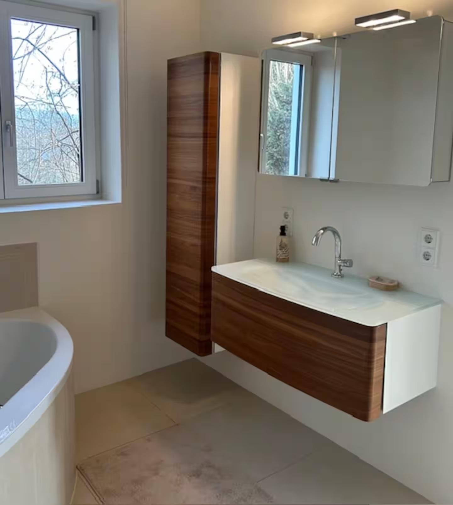 Das Bad mit seinen 2 Fenster verfügt über eine Badewanne, extra Dusche, Waschbecken und Toilette.