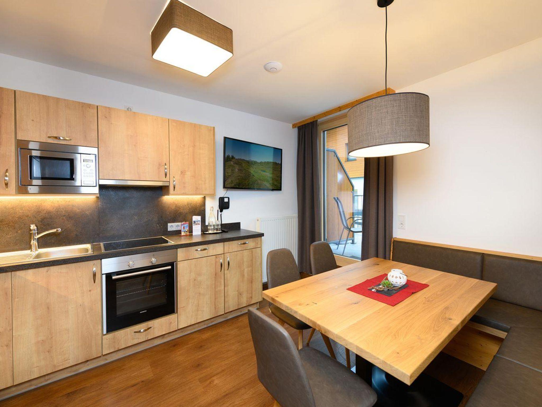 Das Appartement hat 2 Schlafzimmer, 1 davon mit Verbindungstür. Die Küche ist komplett mit Backrohr, E-Herd mit Cerankochfeld, Geschirrspüler, Wasserkoche, Kaffeemaschine und Kühlschranke mit Gefrierfach ausgestattet. Im Appartement Edelweiß gibt es 1 x Dusche/WC. Flat-TVs, Fön, Telefon, Safe und kostenloses highspeed W-Lan sind selbstverständlich.