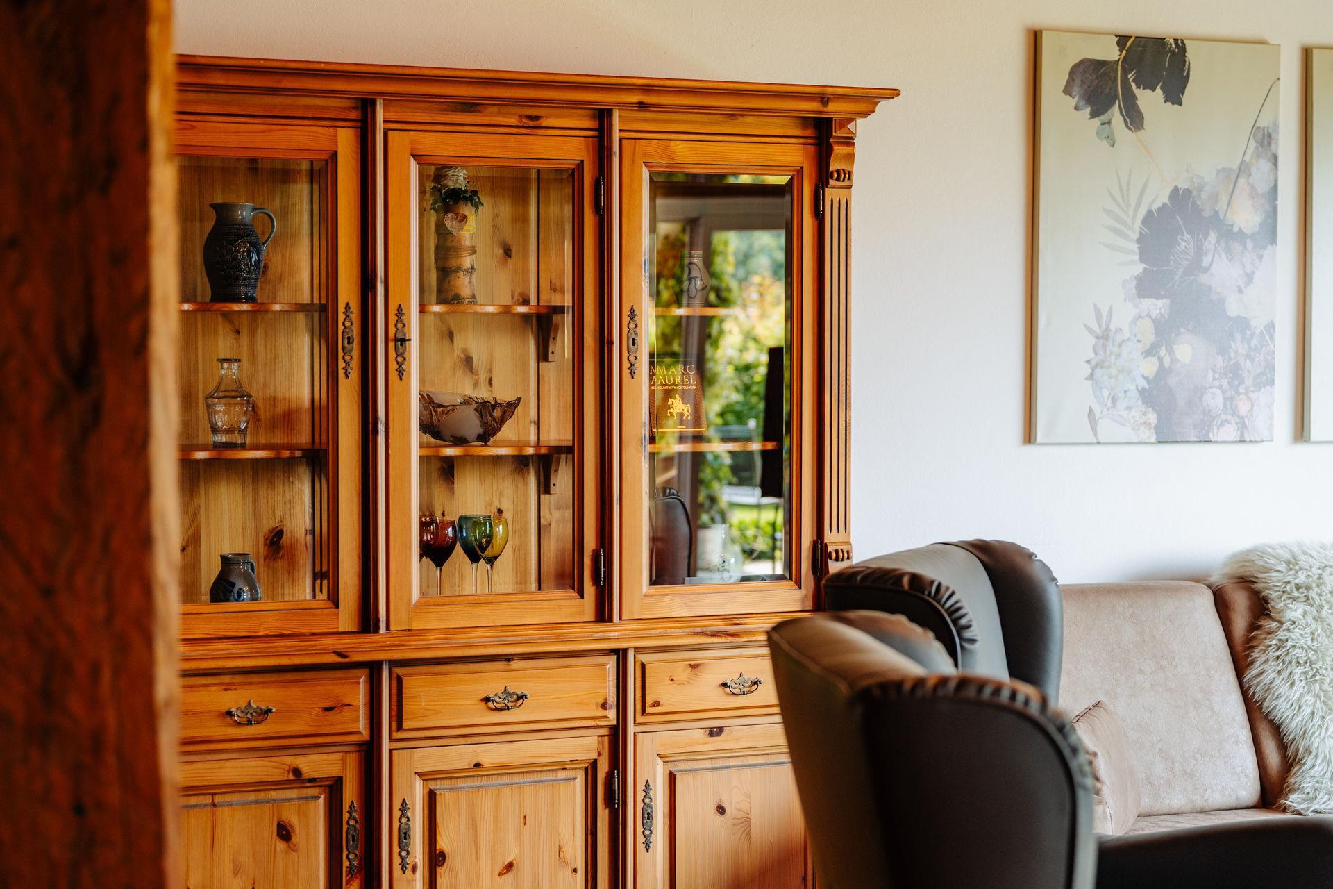 - Wohnzimmer mit Panoramafenster, Zugang zur Terrasse, gemütlicher Sitzgarnitur, Esstisch, offener Kamin mit Kaminholz,