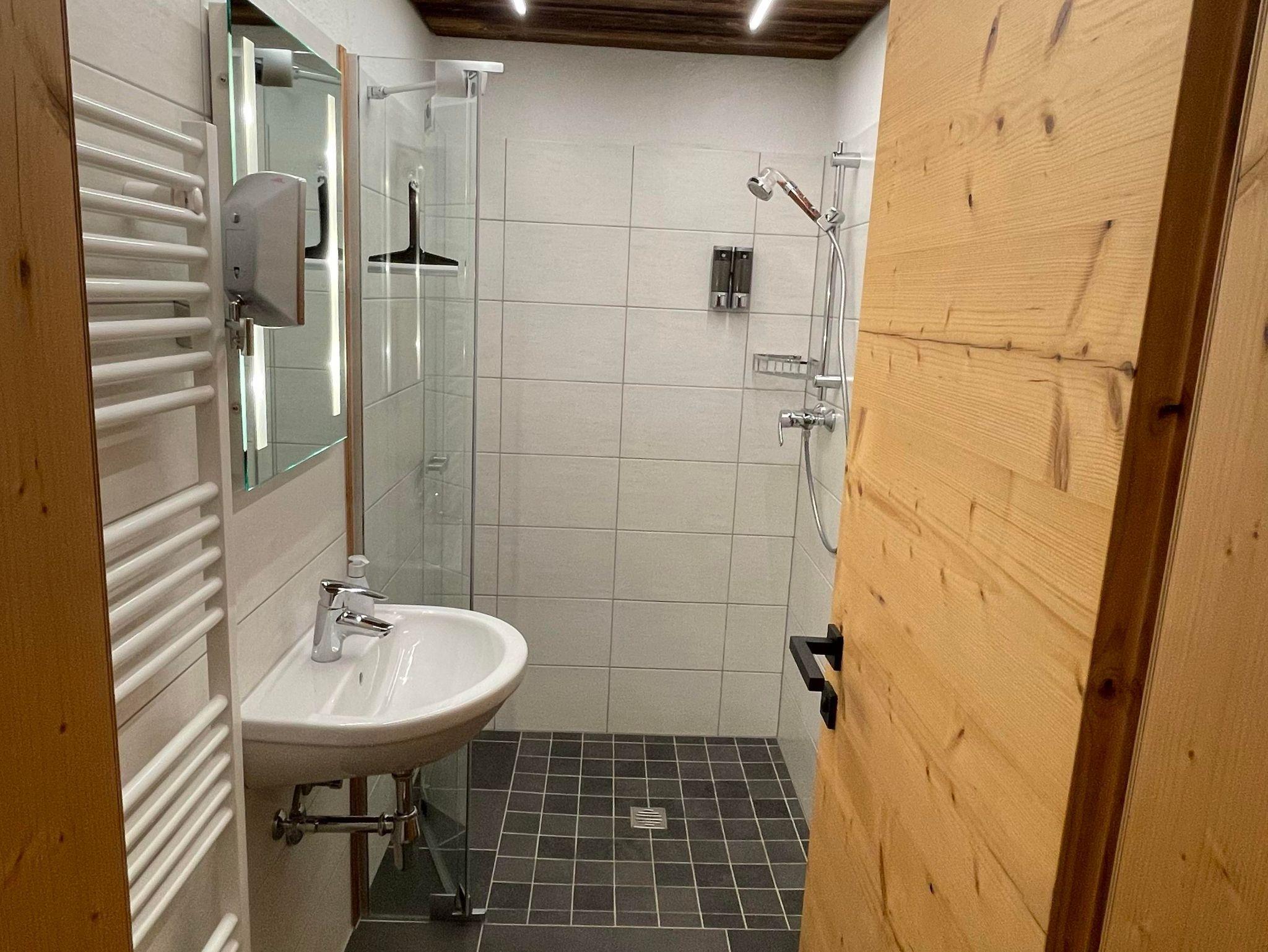 Im Badezimmer befindet sich eine großzügige Dusche.