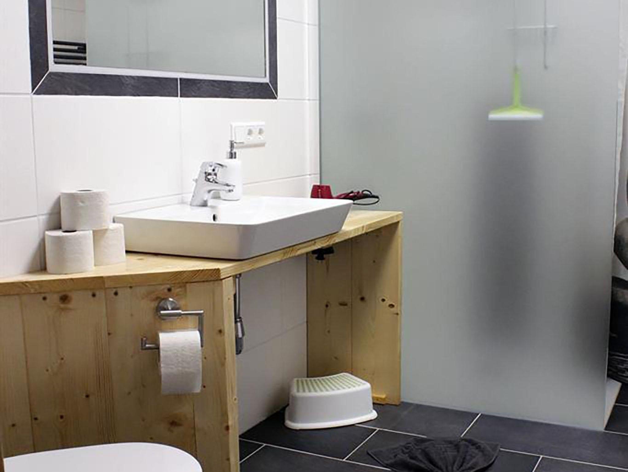 Das Bad hat eine geräumige Dusche, einen Waschtisch und WC. Ein Fön, Seifenspender und Hand-/Badetücher sind ebenfalls vorhanden.