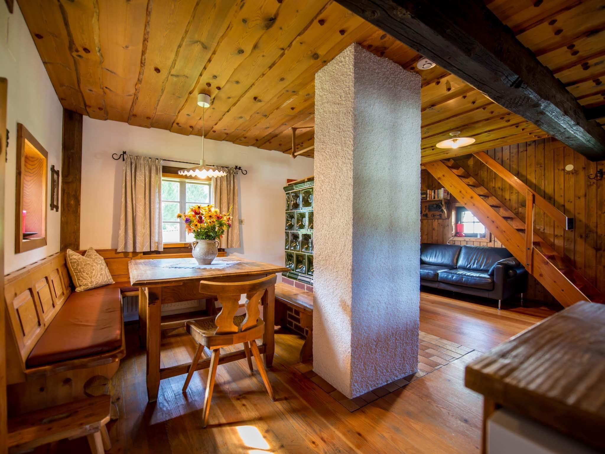 Holzblockhaus mit 90 m² aus dem 17. Jhdt., Parterre: Wohnraum mit Kachelofen, getrennte kleine Küche, Dusche/WC, 1. Stock: 2 Zweibettzimmer, Spitzboden: 1 Bett. Sat-TV.