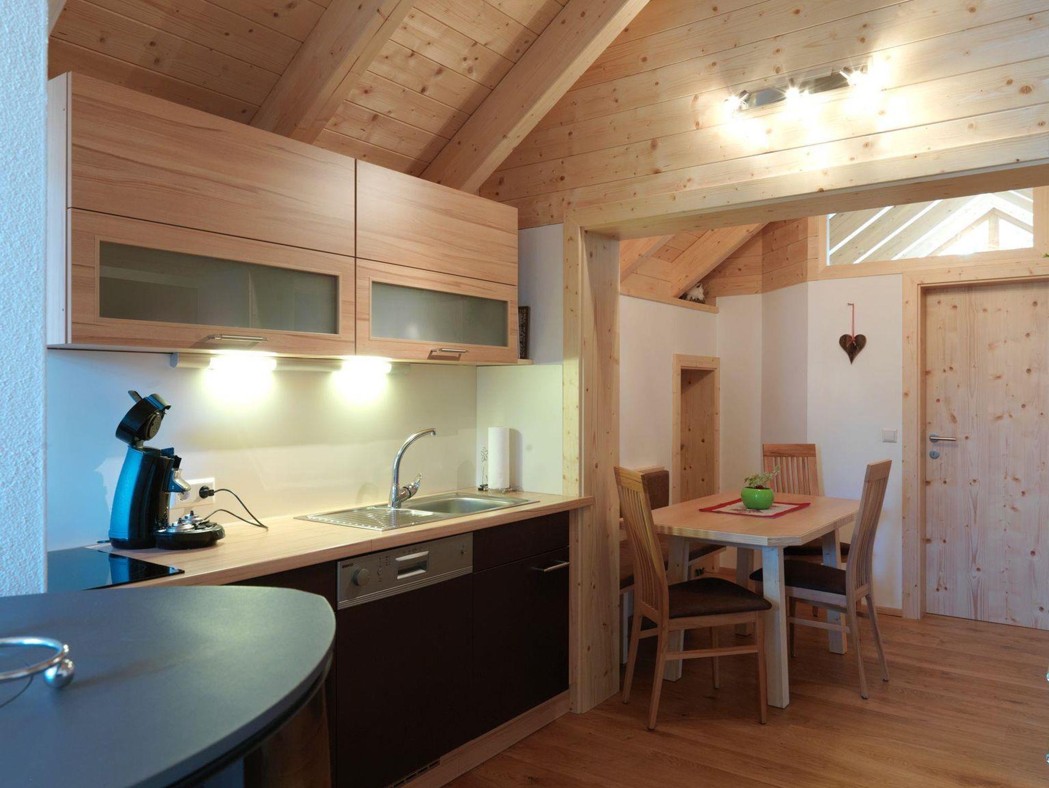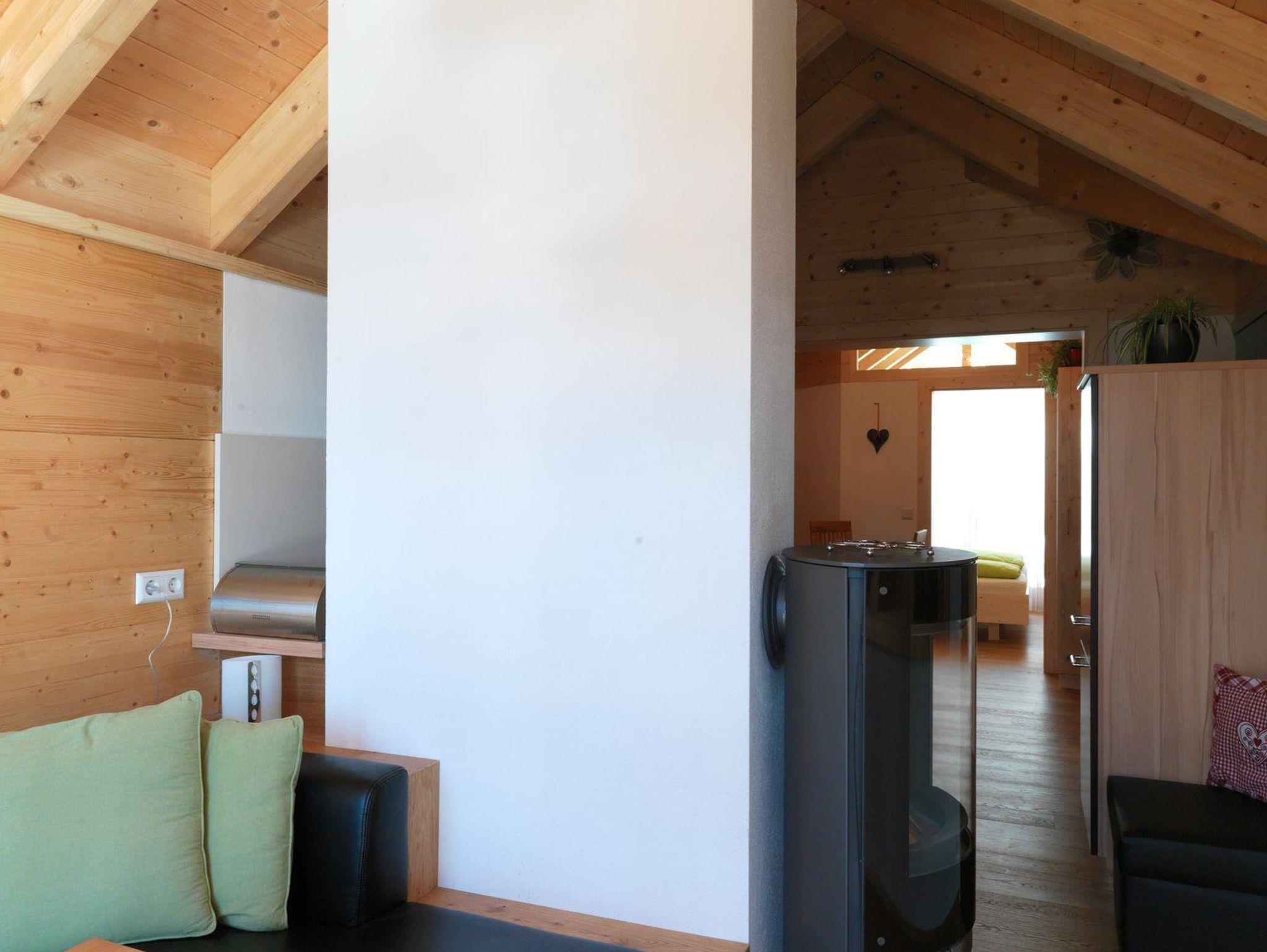 FeWo HÜTTENZAUBER, 45m2, Vorraum, 1 Schlafzimmer, Wohnraum mit Essbereich, Küchenbereich (Ceranfeld, Backrohr, Geschirrspüler, Kaffeemaschine, Toaster, Eierkocher), Dusche mit WC, Kaminofen als Raumteiler für den gemütlichen Wohnbereich mit Gartnerkofelblick, Couch, SAT TV, und kleinem Balkon