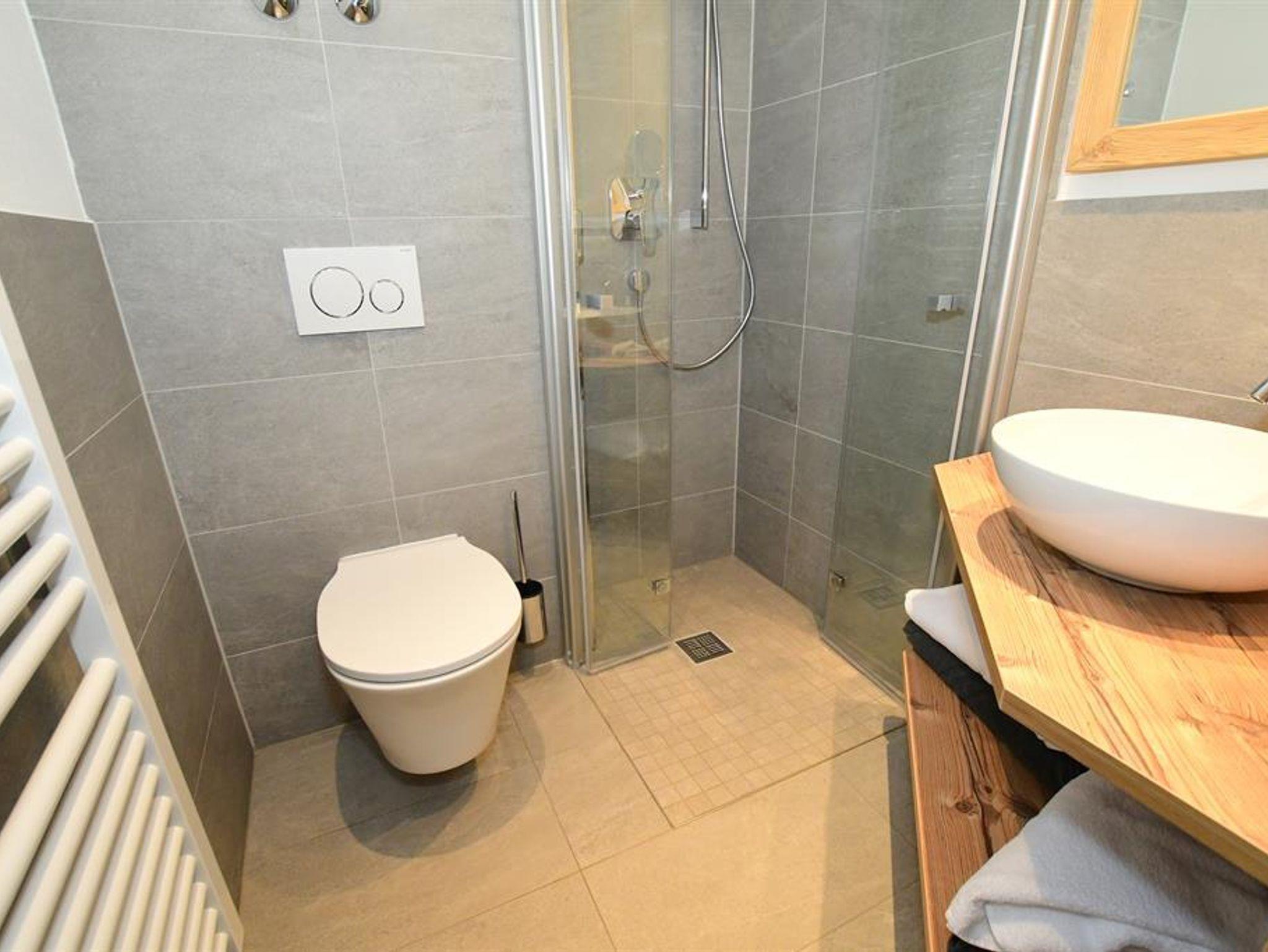 • Duschbad mit Fön, Kosmetikspiegel und WC. Barrierefei mit Rollstuhl zu befahren.