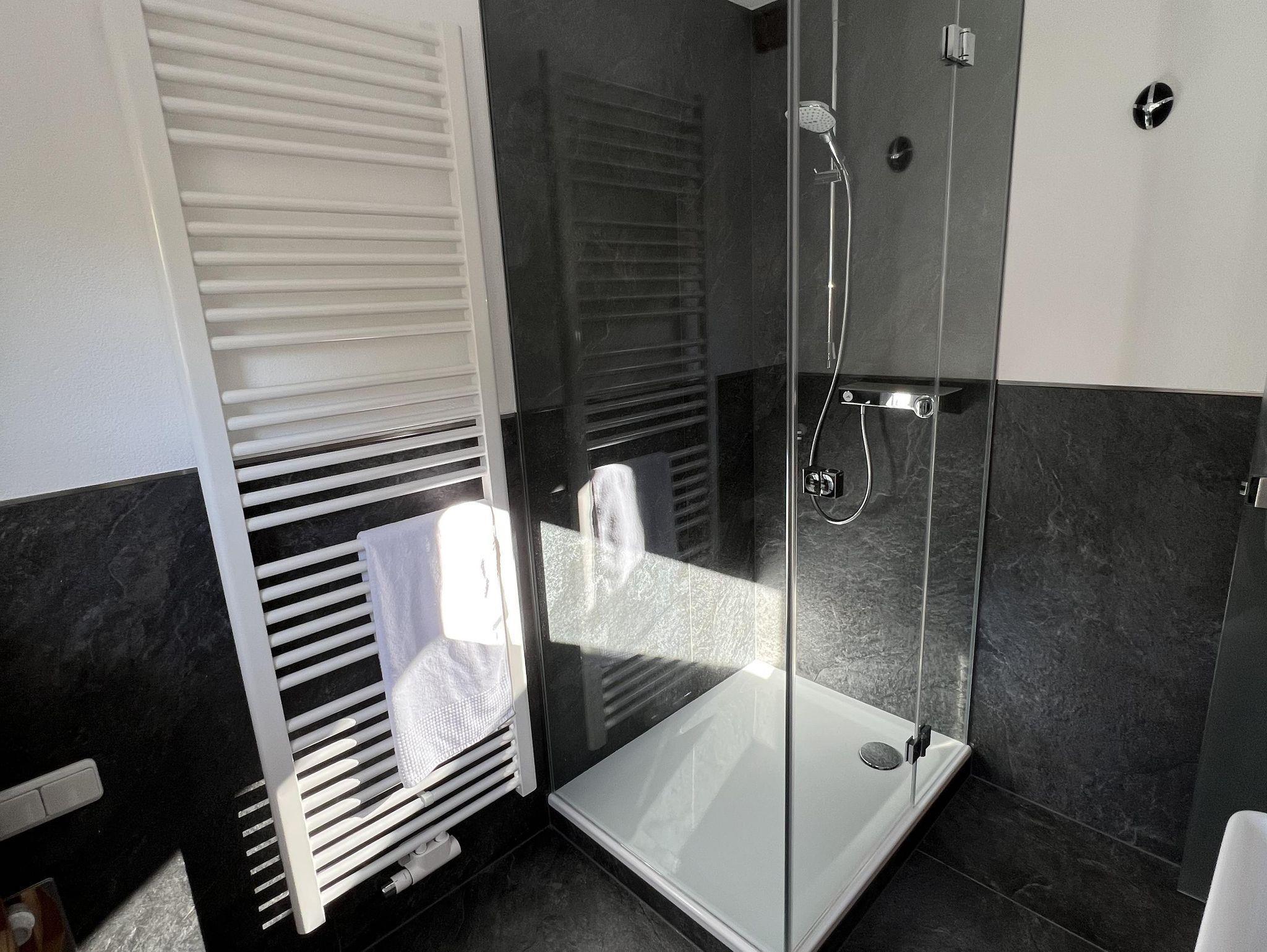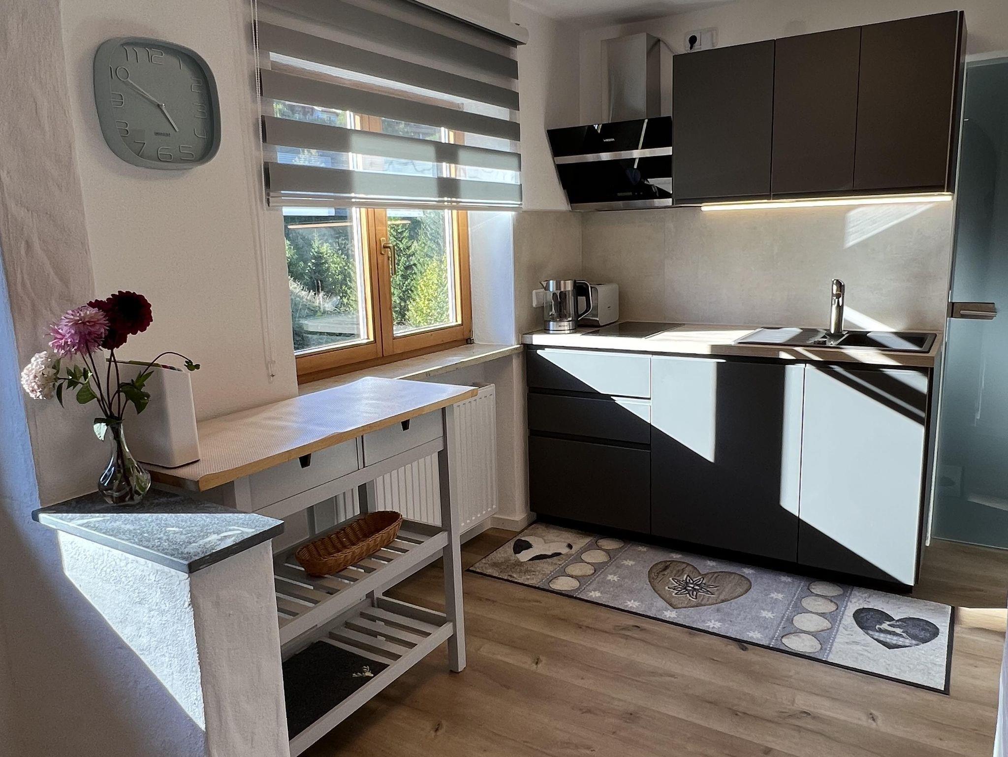 Schöne Ferienwohnung im Obergeschoss (renoviert 2022) mit Dusche/WC, Küchenzeile mit Kühlschrank/Gefrierfach, Geschirrspülmaschine, TASSIMO Kapsel-Maschine, Wasserkocher, Toaster und 2er Touch Control Cerankochfeld. Wohnbereich mit Massivholztisch, Fernseher mit A1-TV-Box und Schlafsofa. Abgetrennter Balkon am Schlafzimmer in Richtung Osten mit Klapptisch und zwei Stühlen. Eigene Terrasse im Garten mit Gartenmöbeln und tollem Ausblick in die Walser Berge.