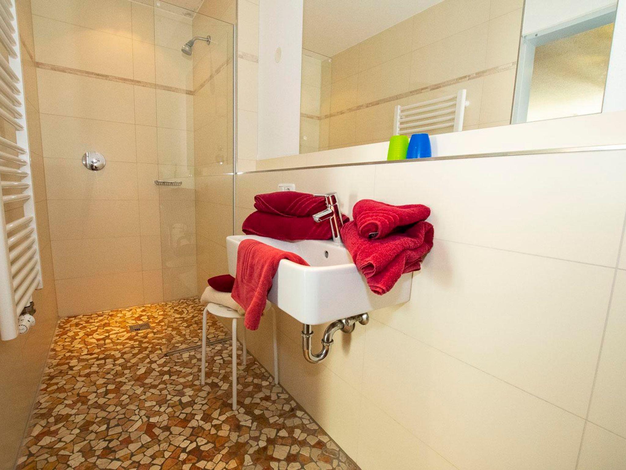 Ebenerdiges Dusch-Bad, inkl. Hand- und Duschseife.
