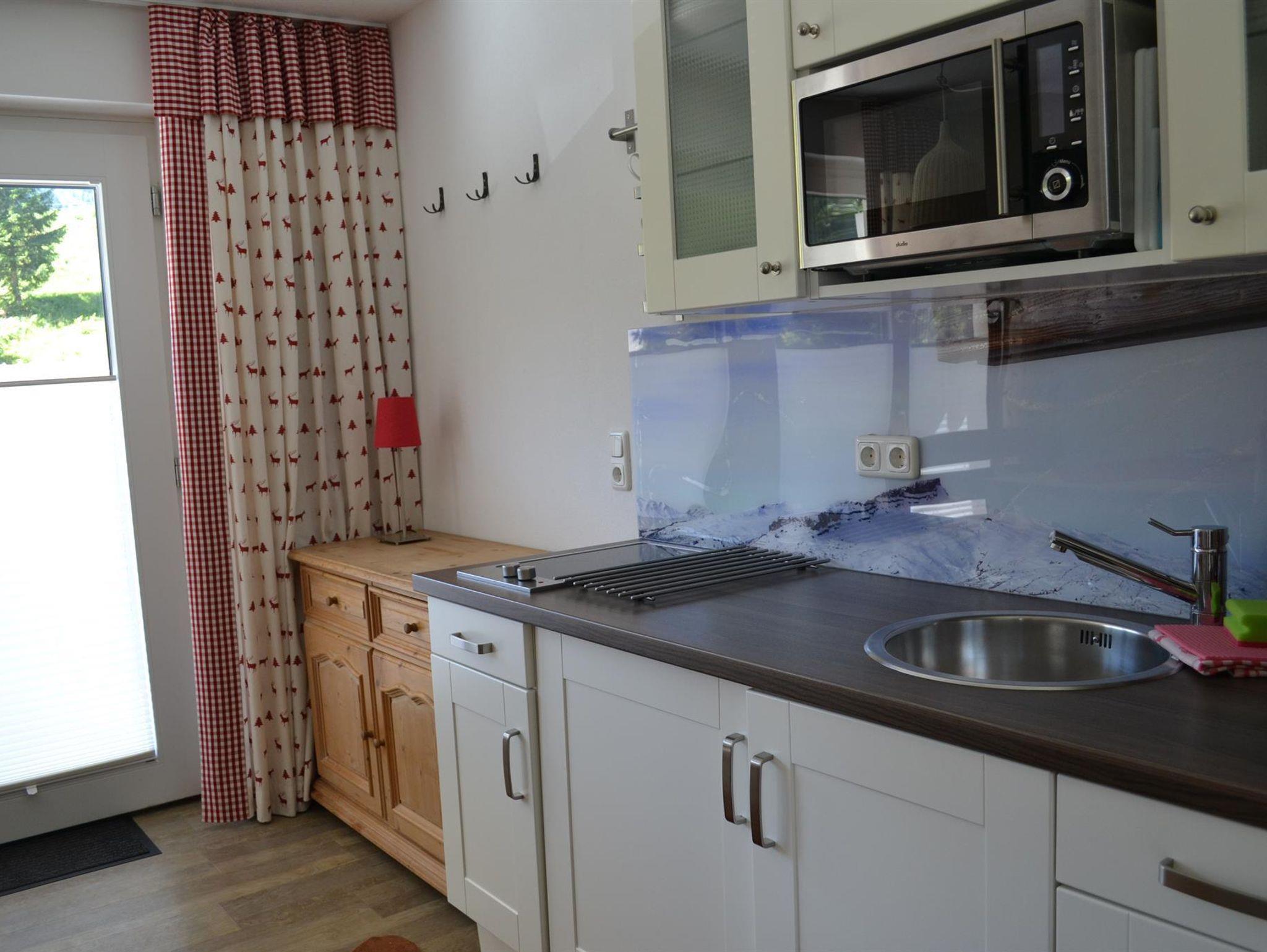 Gemütliches, kleines 1,5 Raum Appartement mit eigenem Eingang über die Terrasse. Im Wohn- Essbereich befindet sich eine Eckcouch mit Esstisch und eine voll ausgestattete Küchenzeile. 2-Platten Herd, Micro-Grill, Wasserkocher, Toaster und Kaffemaschine.