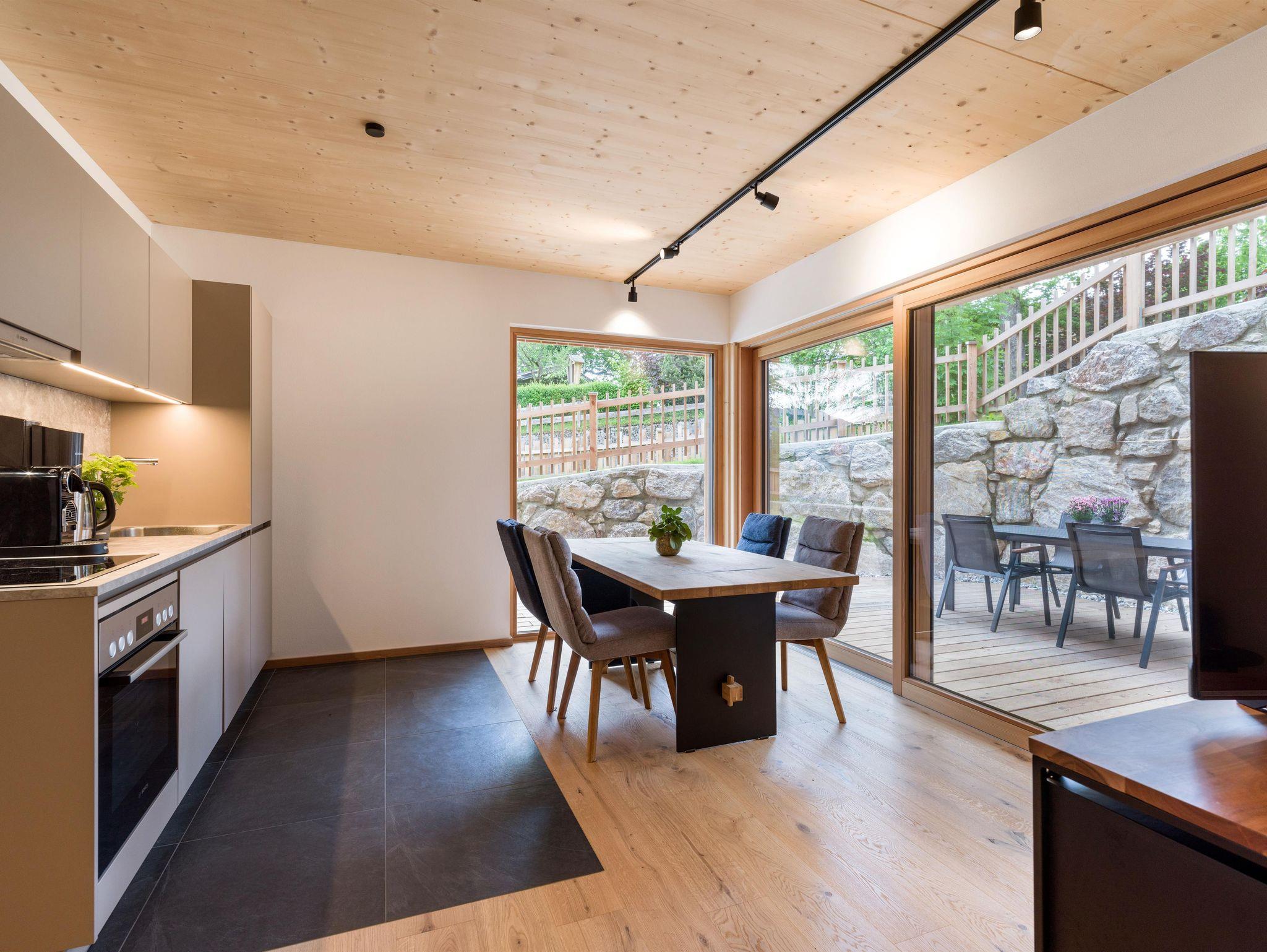 Das Apartment Morgentau im Erdgeschoss eignet sich für max. 6 Personen und besteht aus einer eigenen Garderobe im Vorraum, einer großzügig, offen gestalteten Wohnküche mit Esstisch, ausziehbarer Couch und TV. Die 2 Schlafzimmer verfügen jeweils über ein Doppelbett und Kleiderschränke. Die Küche ist mit Geschirrspüler, Kühlschrank mit Tiefkühlfach, Herd, Backofen, Kaffeemaschine, Wasserkocher, Geschirr, Gläsern, Kochtöpfen, Kochutensilien und Besteck voll für Profi- und Hobbyköche ausgestattet