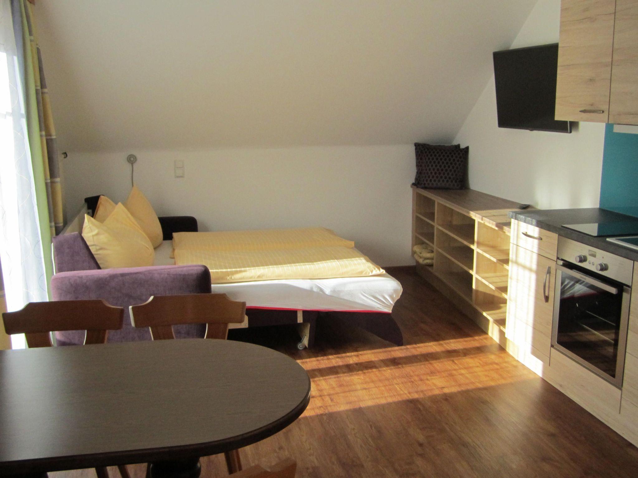 The holiday flat in question is located on the first floor and extends over 40m². It is characterised by a modern eat-in kitchen equipped with every comfort: a ceramic hob, oven, filter coffee machine, kettle, dishwasher, fridge with freezer compartment and microwave. Next door is a cosy dining area and a living area with a flat-screen TV and a sofa bed for two more people. The bedroom has a SAT TV and a comfortable double bed. The bright bathroom is equipped with a double washbasin, hairdryer, towel dryer and shower; the WC is separate.