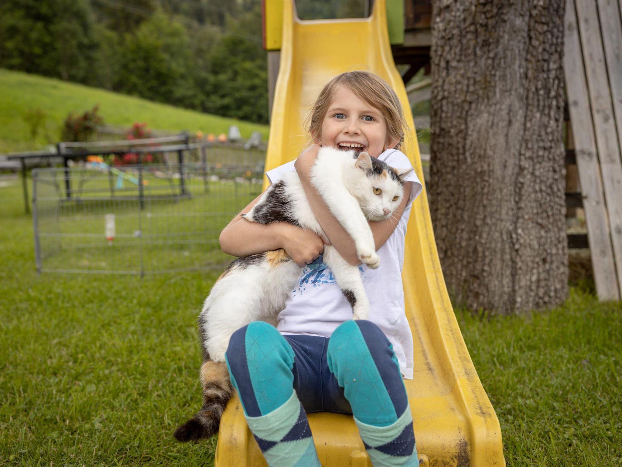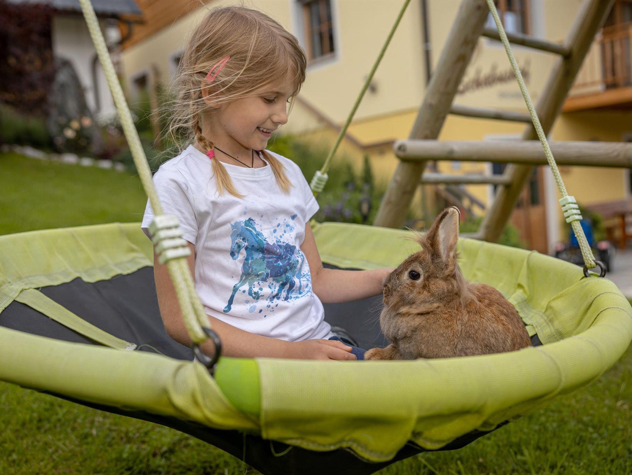 Unser Hof selbst bietet eine Vielzahl von tierischen Freunden – von Hasen über Katzen, Hühner, Rinder bis hin zu Pferden und Ziegen . Wenn Ihre Kinder beim Tiere füttern mithelfen oder auf dem Kinderspielplatz toben, können Sie sich auf der Liegewiese entspannen, während der Duft von Kräutern und frischen Blumen in der Luft liegt.