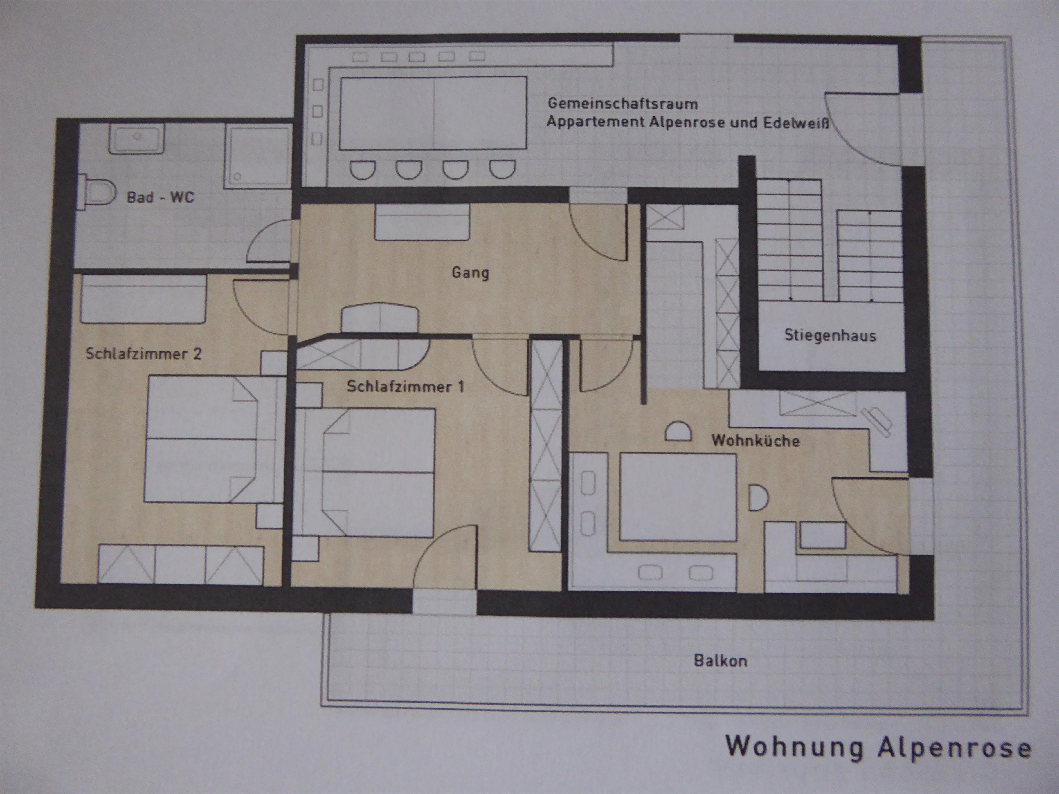 Die Ferienwohnung Alpenrose befindet sich auch im 1.Stock, ist mit ca.74 m2 Gesamtfläche sehr groß, Allergiker geeignet, komplett eingerichtet, mit Geschirrspüler, 2 getrennte große Schlafzimmer, eine Wohn-Küche, ein großes Bad, einen Vorraum und einen Balkon