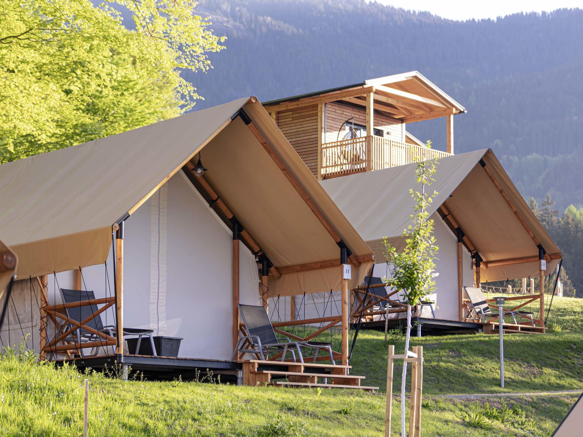 Kötschach-Mauten: Car free modern resort "Chalets/Glamping Nassfeld by AlpsR.", 700 m a.s.l.. 500 m from the centre, in a sunny position on a slope, directly by the skiing area. For shared use: children's playground. In the complex: reception, kiosk. Parking. E-charging station. Supermarket 850 m. Golf course (18 hole) 20 km, skisport facilities, ski rental 200 m. Well-known ski regions can easily be reached: Nassfeld 25 km. Well-known lakes can easily be reached: Pressegger See. Hiking paths: Nassfeld-Pressegger See. The holiday properties may differ in living space, floorplan, equipment and furnishing.