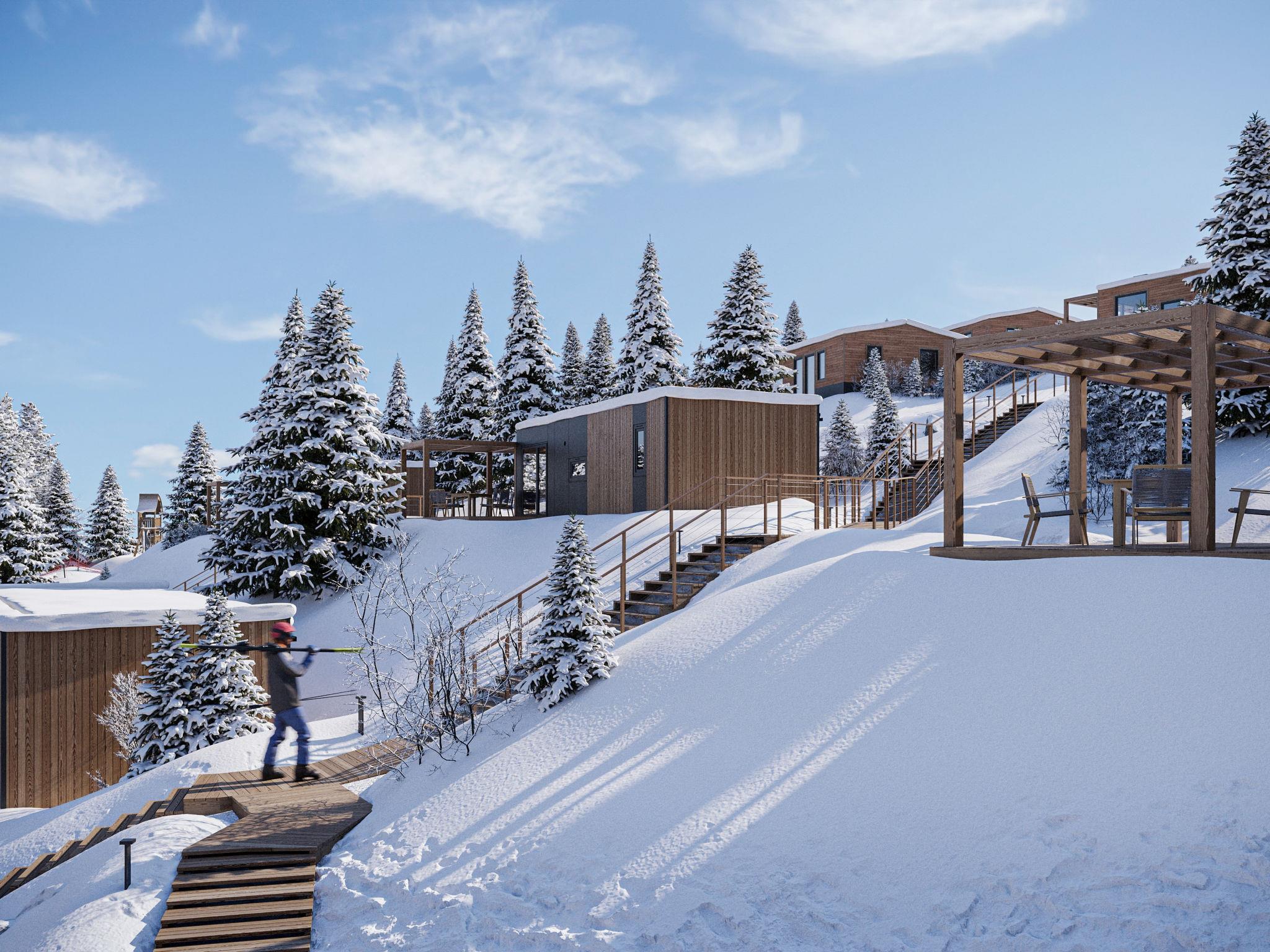 Kötschach-Mauten: Car free modern resort "Chalets/Glamping Nassfeld by AlpsR.", 700 m a.s.l.. 500 m from the centre, in a sunny position on a slope, directly by the skiing area. For shared use: children's playground. In the complex: reception, kiosk. Parking. E-charging station. Supermarket 850 m. Golf course (18 hole) 20 km, skisport facilities, ski rental 200 m. Well-known ski regions can easily be reached: Nassfeld 25 km. Well-known lakes can easily be reached: Pressegger See. Hiking paths: Nassfeld-Pressegger See. The holiday properties may differ in living space, floorplan, equipment and furnishing.