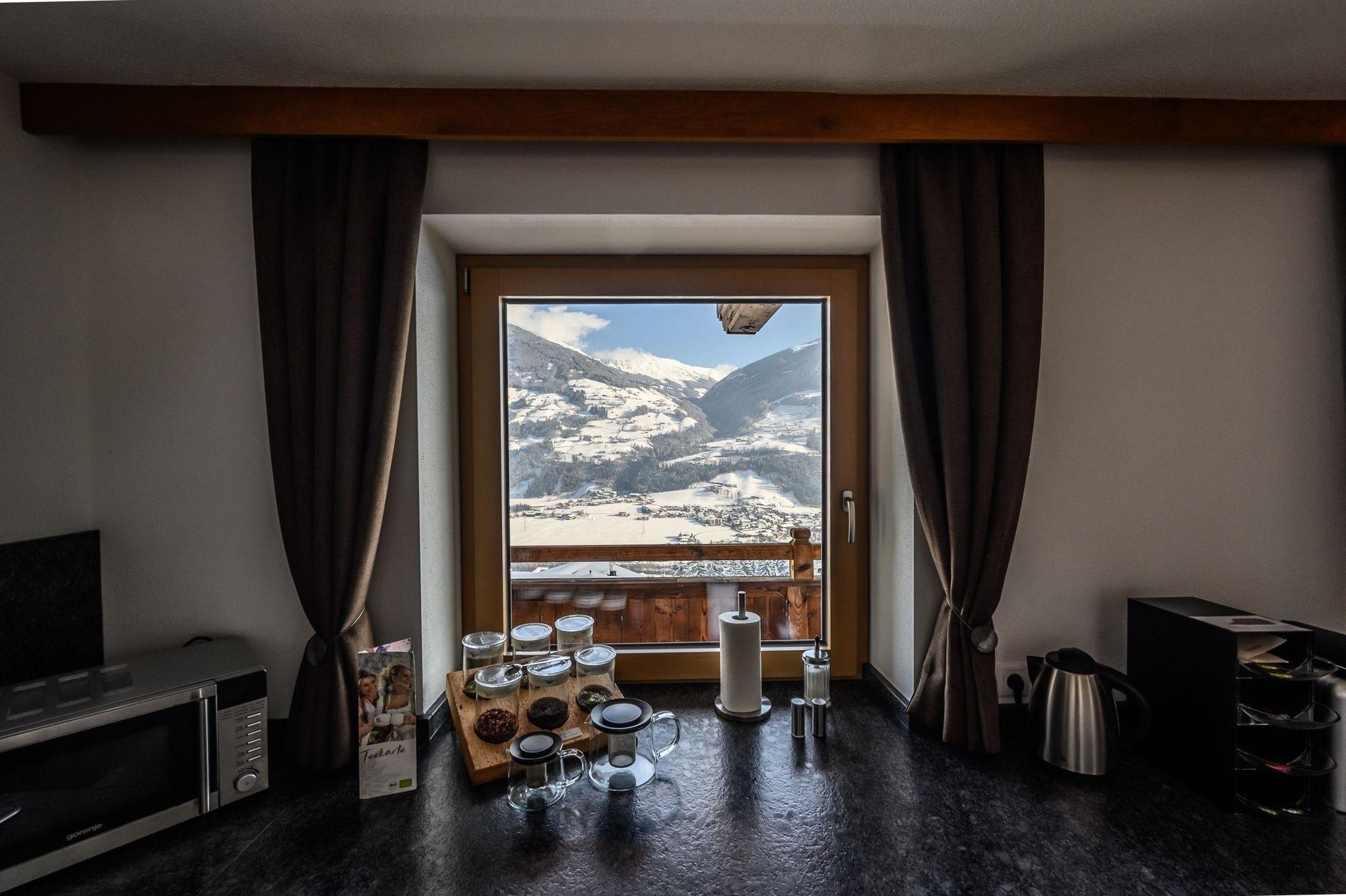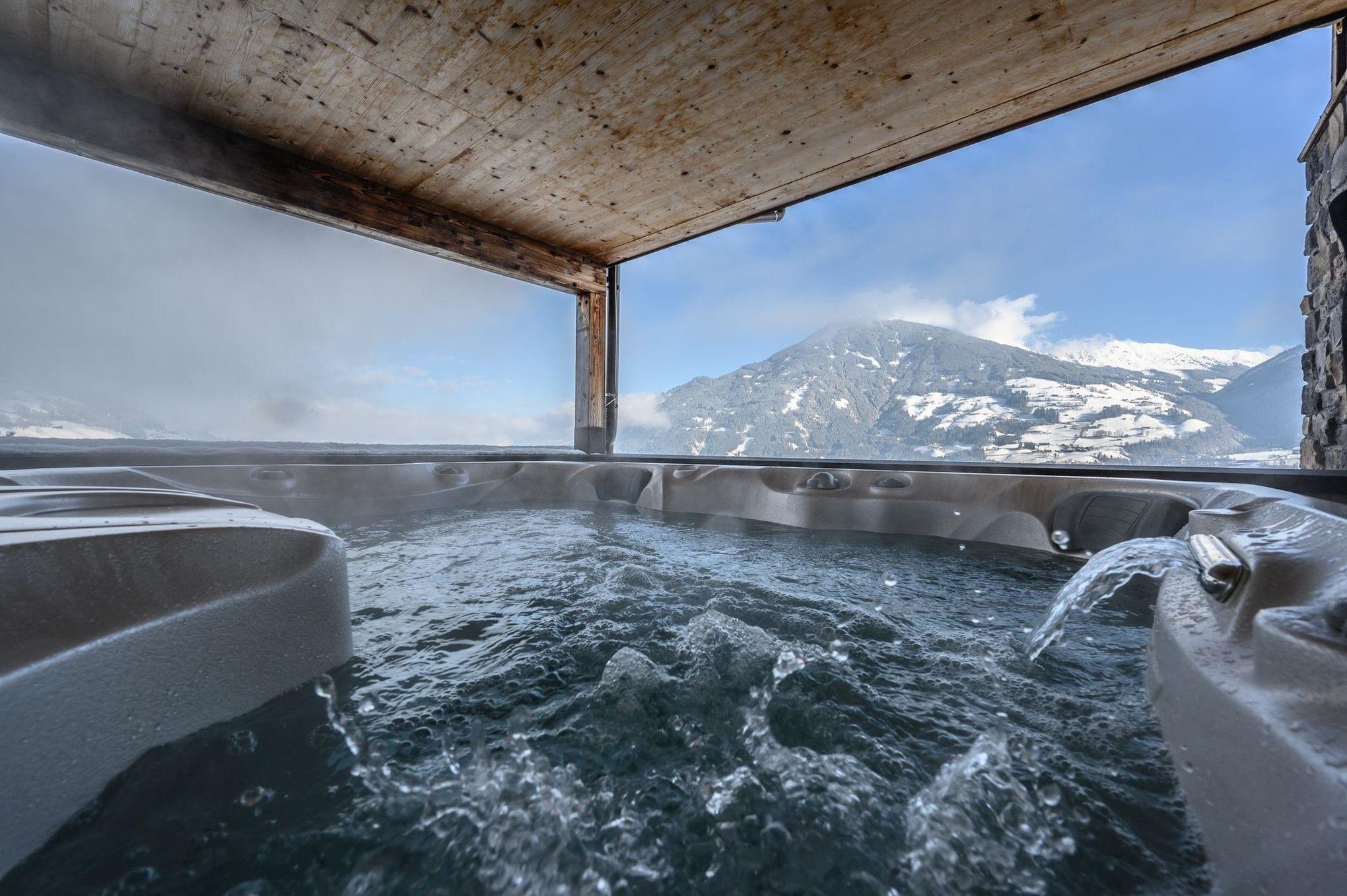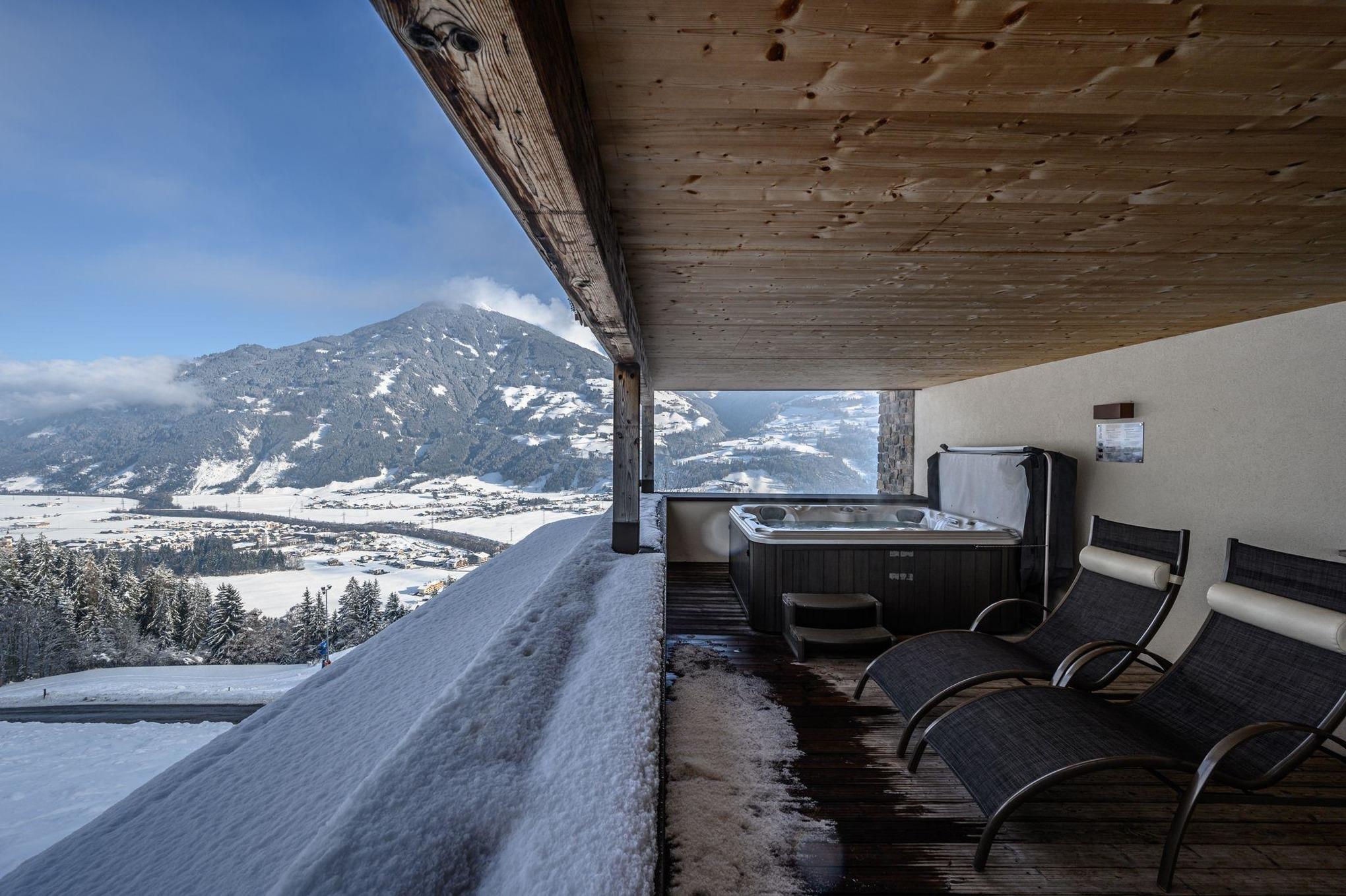 Ein großer Balkon bieten Ihnen die freie Sicht auf die Bergwelt des Zillertales. Vom Balkon aus können Sie es sich im Whirlpool so richtig gemütlich machen und die Bergwelt bei einem Glas Wein bestaunen.