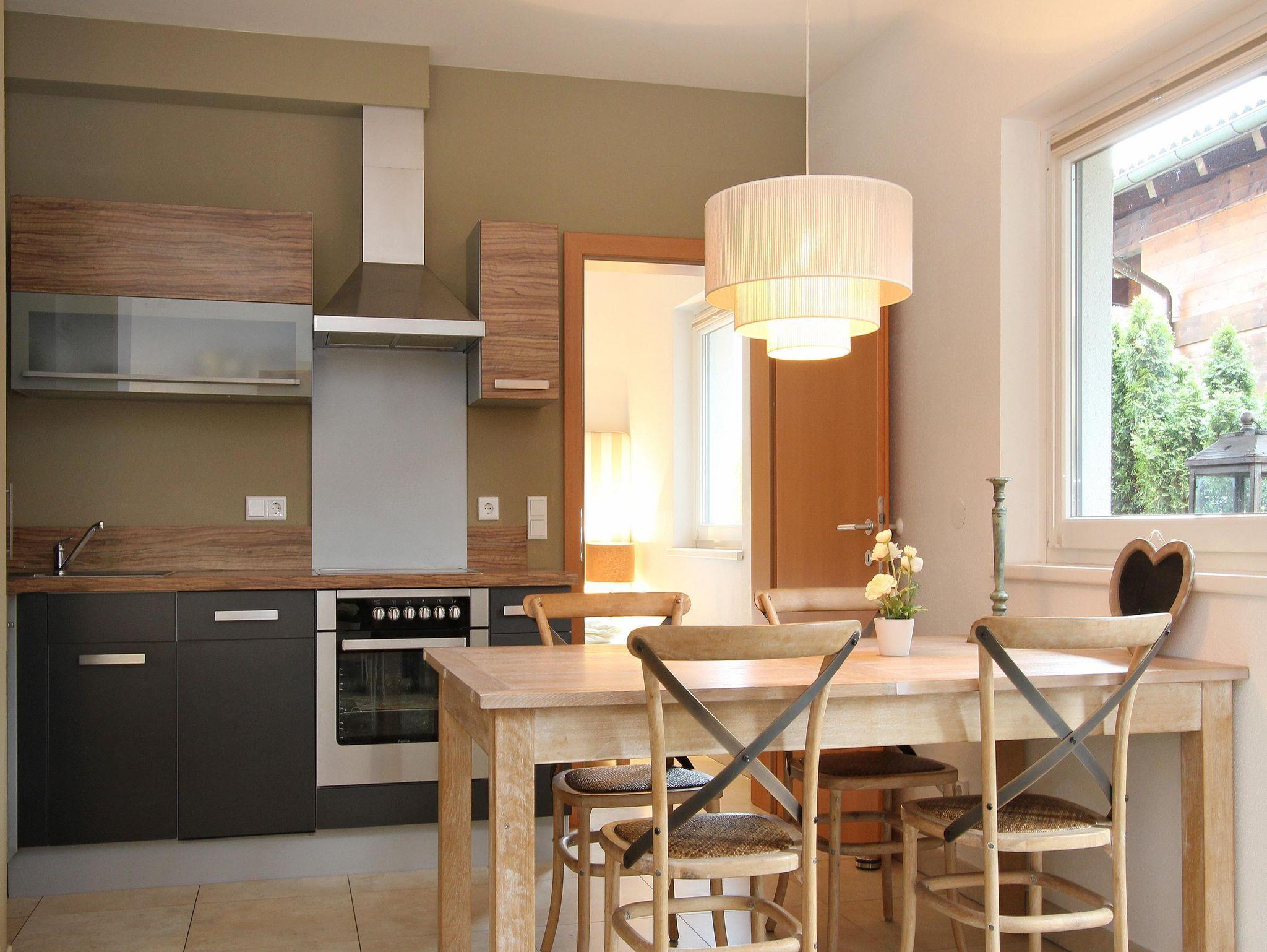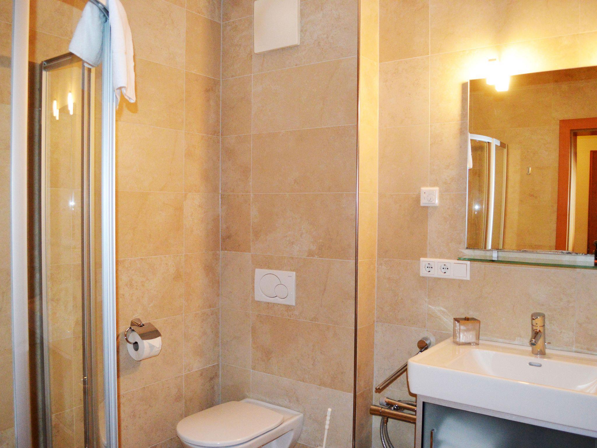 Das Ein-Schlafzimmer Apartment mit Doppelbett liegt im Erdgeschoss und verfügt über eine Fußbodenheizung. Das Badezimmer ist mit einer Dusche, Waschbecken und Toilette ausgestattet. Über den Flur gelangt man in das komfortable und geräumige Wohnzimmer mit gemütlicher Sitzecke und integrierter Schlafcouch. Die offene Küche und der Esstisch bieten eine ideale Umgebung für gemeinsame Mahlzeiten und geselliges Beisammensein.