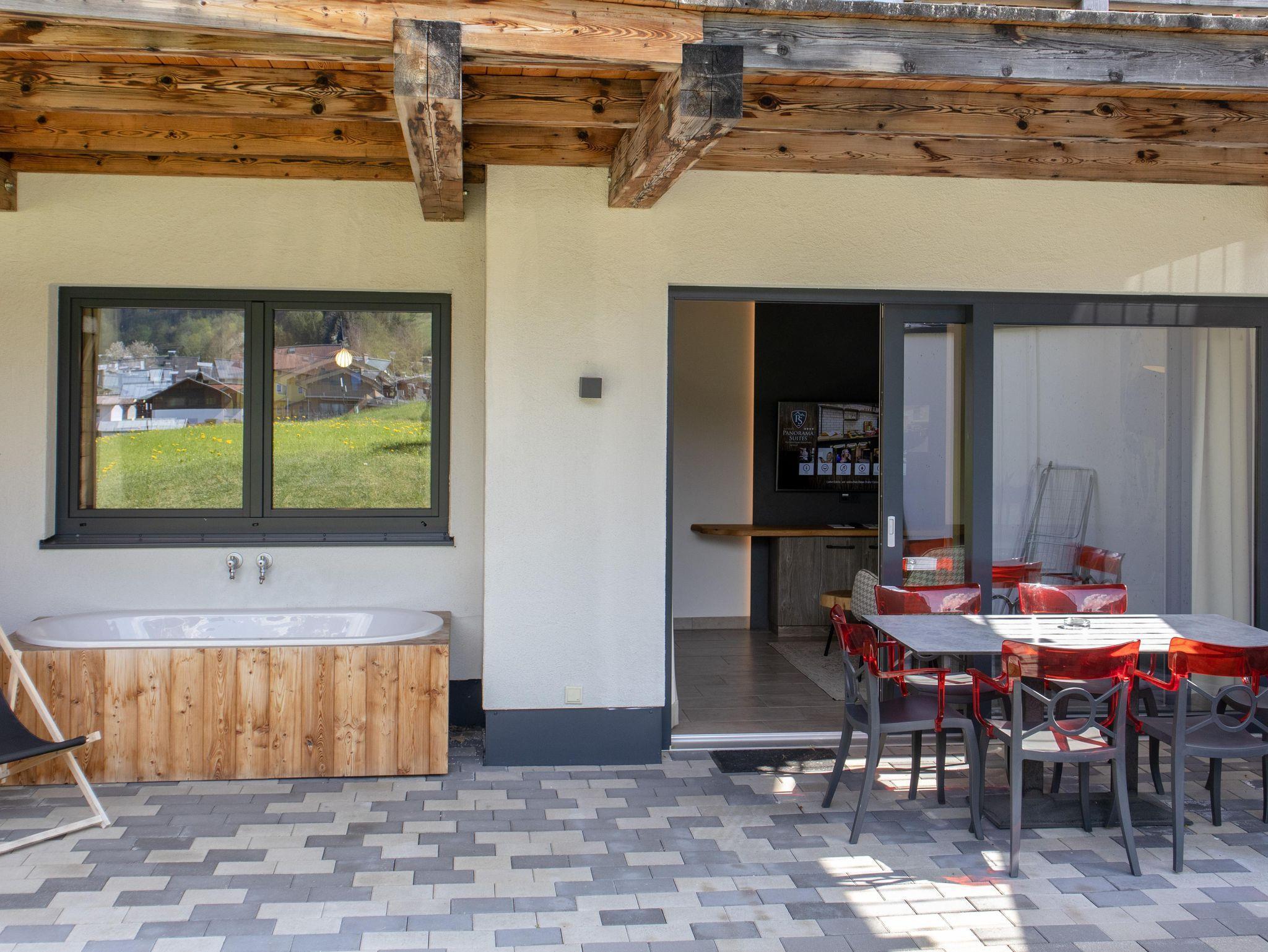 Unsere gemütlichen Panorama Suites mit Outdoor-Badewanne und tollem Bergblick befinden sich im ersten und zweiten Chalet. Das Schlafzimmer ist mit einem bequemen Doppelbett ausgestattet und es gibt zwei Badezimmer mit jeweils einer Dusche und einem WC. Im Wohnzimmer gibt es einen Esstisch und eine offene Design-Küche sowie eine Sitzecke mit einer Schlafcouch (für 2 Personen). Auf dem großen Balkon können Sie den schönen Ausblick auf das Kitzsteinhorn in Ihrer eigenen freistehenden Outdoor-Badewanne genießen. Egal ob im Sommer oder im Winter, bietet dieser einzigartige Platz am Balkon eine perfekte Möglichkeit zum Abschalten und Relaxen.