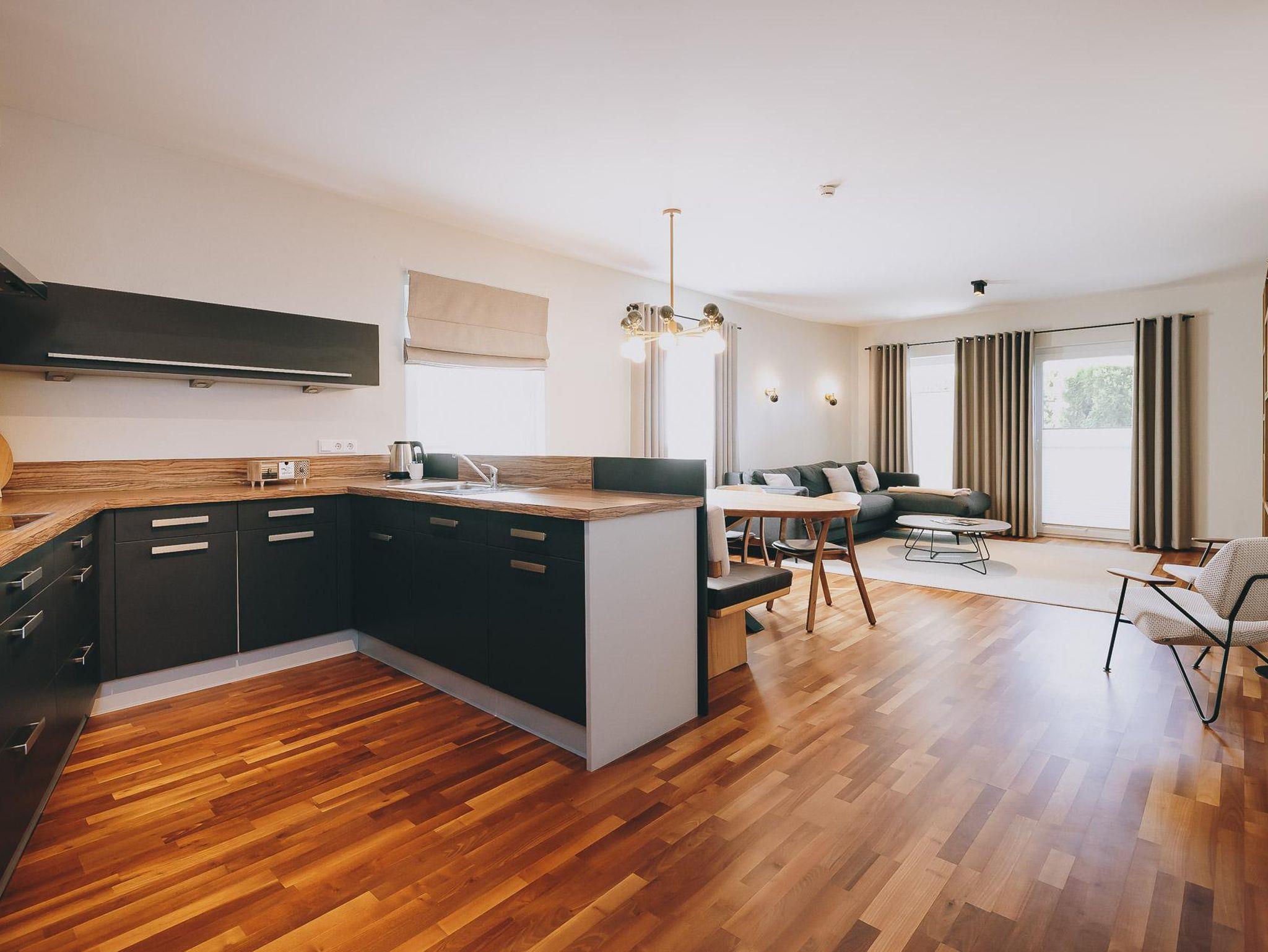 Zwei komplett getrennte Schlafzimmer, ein Masterbedroom , ein „White Room“ mit riesigem Panoramafenster und eine „Knautsch Couch“ für Familienabende stehen auf 77qm zur Verfügung!