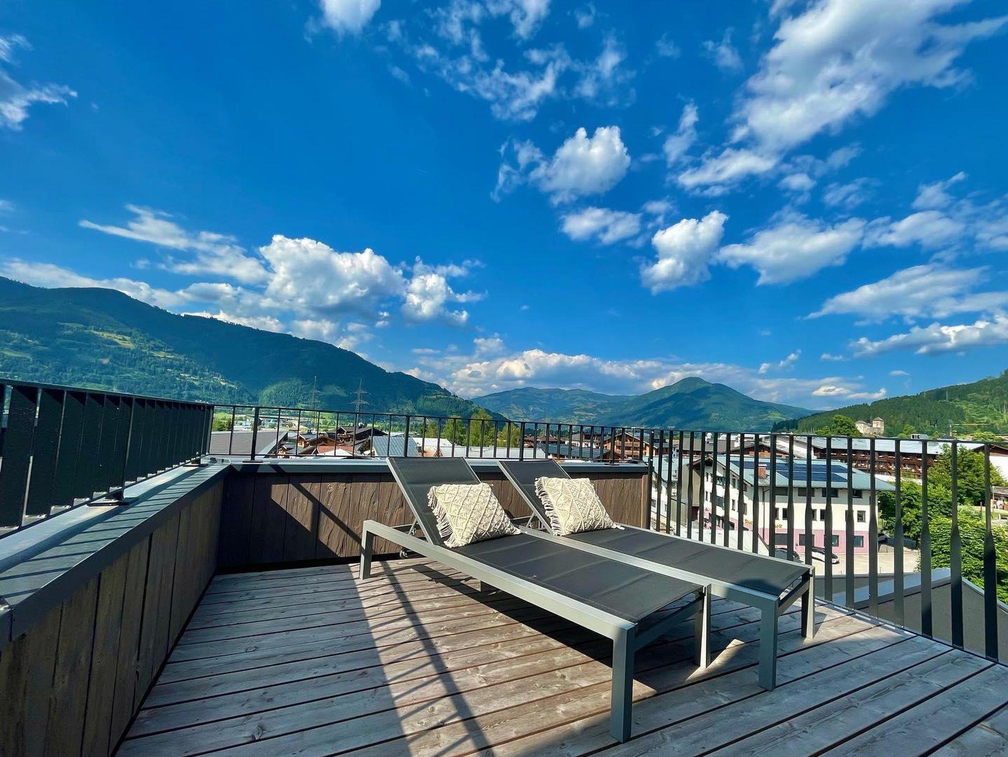 • Terrasse mit Ausblick über den Dächern von Kaprun