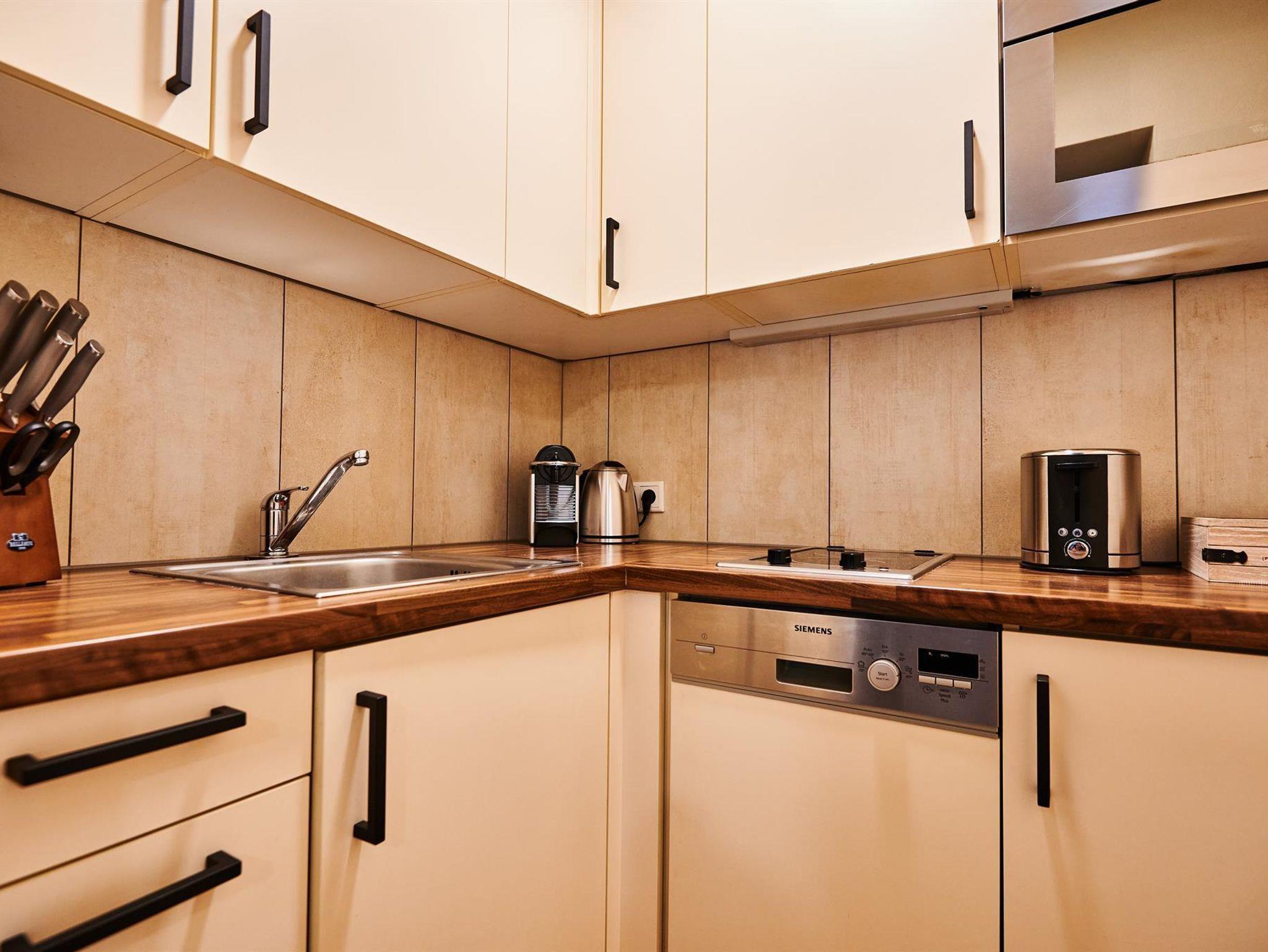 Die exzellent ausgestattete Küche befindet sich im Wohnzimmer: Besteck, Geschirr, Mikrowelle sowie eine Kühl- Gefrierkombination. Über den Geschirrspüle freuen sich alle, die so wie wir im Urlaub nicht gerne abwaschen. Selbstverständlich haben wir eine Kaffeemaschine, Wasserkocher und Toaster im Apartment, um für den perfekten Start in einen erlebnisreichen Tag zu garantieren. Am Abend verwöhnt ihr eure Liebsten mit allem was ihr an Küchenzubehör für eure leckersten Speisen benötigt. All jene, die den Abend gerne im Freien verbringen, finden einen kleinen Grillplatz im Garten.