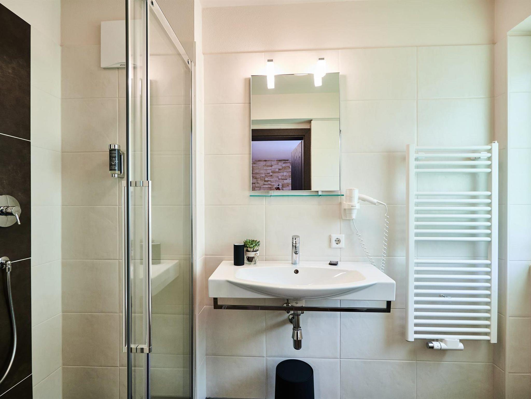 Wir haben die Wohnung in je ein Schlaf- bzw. Wohnzimmer eingeteilt und bieten Platz für bis zu 4 Personen. Ebenfalls haben wir für unsere Gäste zwei moderne Bäder mit ebenerdiger Dusche eingerichtet. Die Unterkunft verfügt weiter über eine allgemeine Waschmaschine, sowie ein Bügeleisen/-brett. Vor dem Haus findet ihr kostenfreie Parkplätze und natürlich bieten wir kostenfreies W-Lan im gesamten Apartment.
