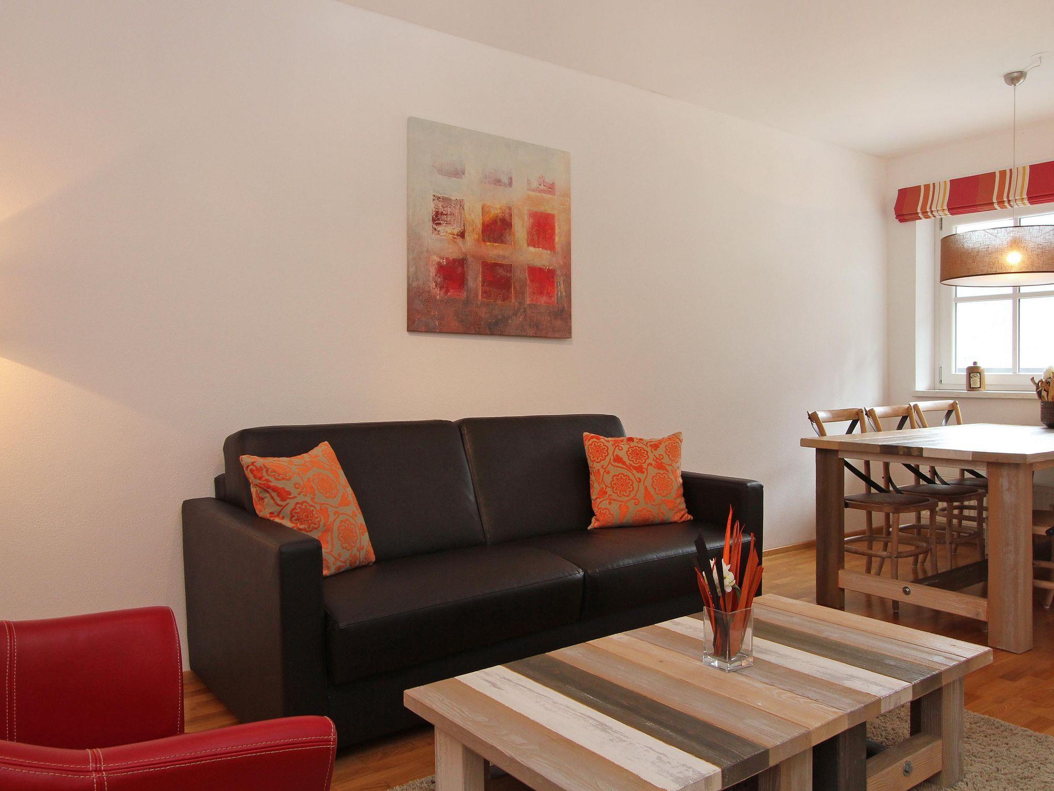 Die Wohnung TOP 8 im zweiten Stock des Alpine Resort verfügt über zwei geräumige Schlafzimmer mit jeweils einem Doppelbett, einem Fernseher und viel Stauraum. Im Badezimmer gibt es eine Badewanne, sowie eine separate Toilette. Im Wohnbereich wartet eine gemütliche Sitzecke mit Schlafcouch, sowie ein Esstisch und eine offene Küche.
