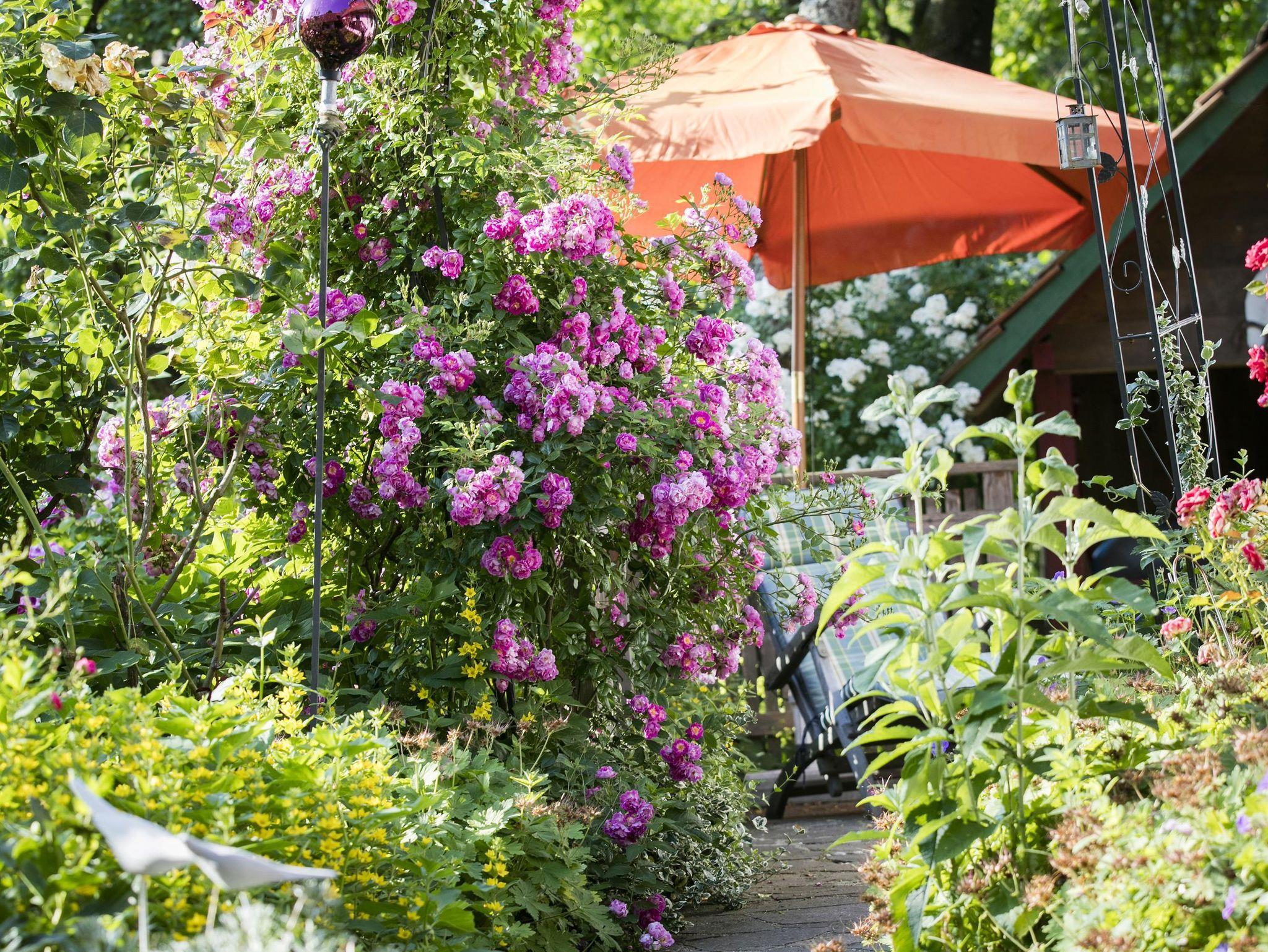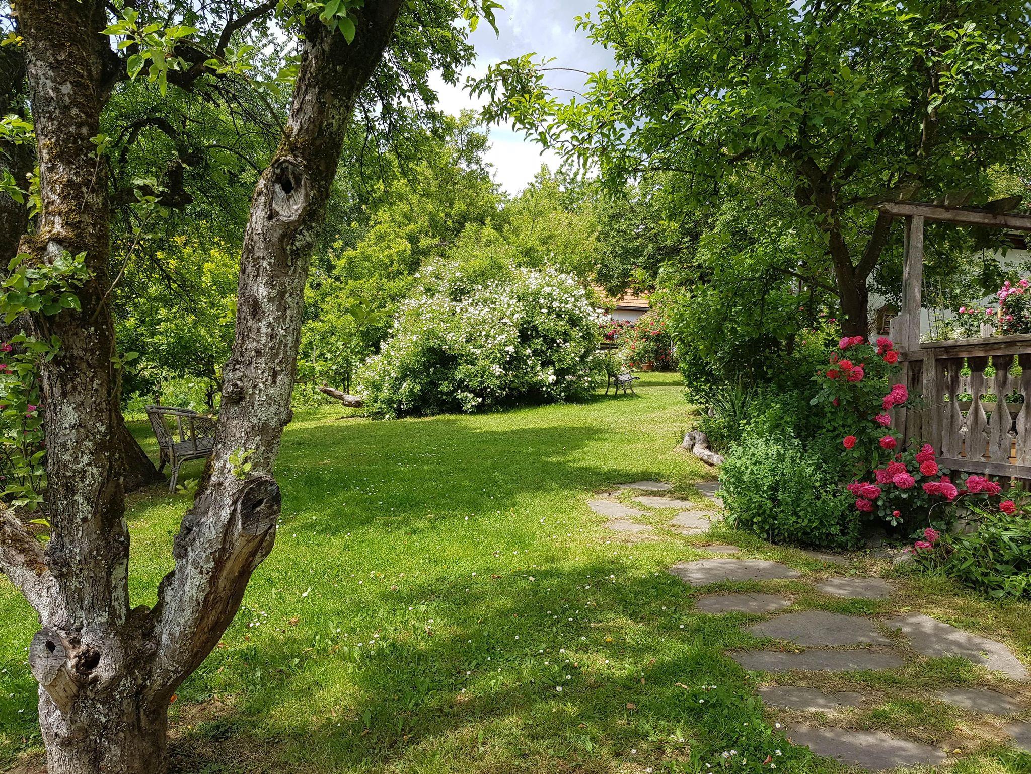 In unserem großen Naturgarten blühen unzählige Blumen wie Rosen und Sträucher, die dazu einladen, durch das grüne Paradies zu schlendern und die Seele baumeln zu lassen. Viele Sonnen- und Schattenplätze genießen Sie im Liegestuhl oder in der Hängematte.