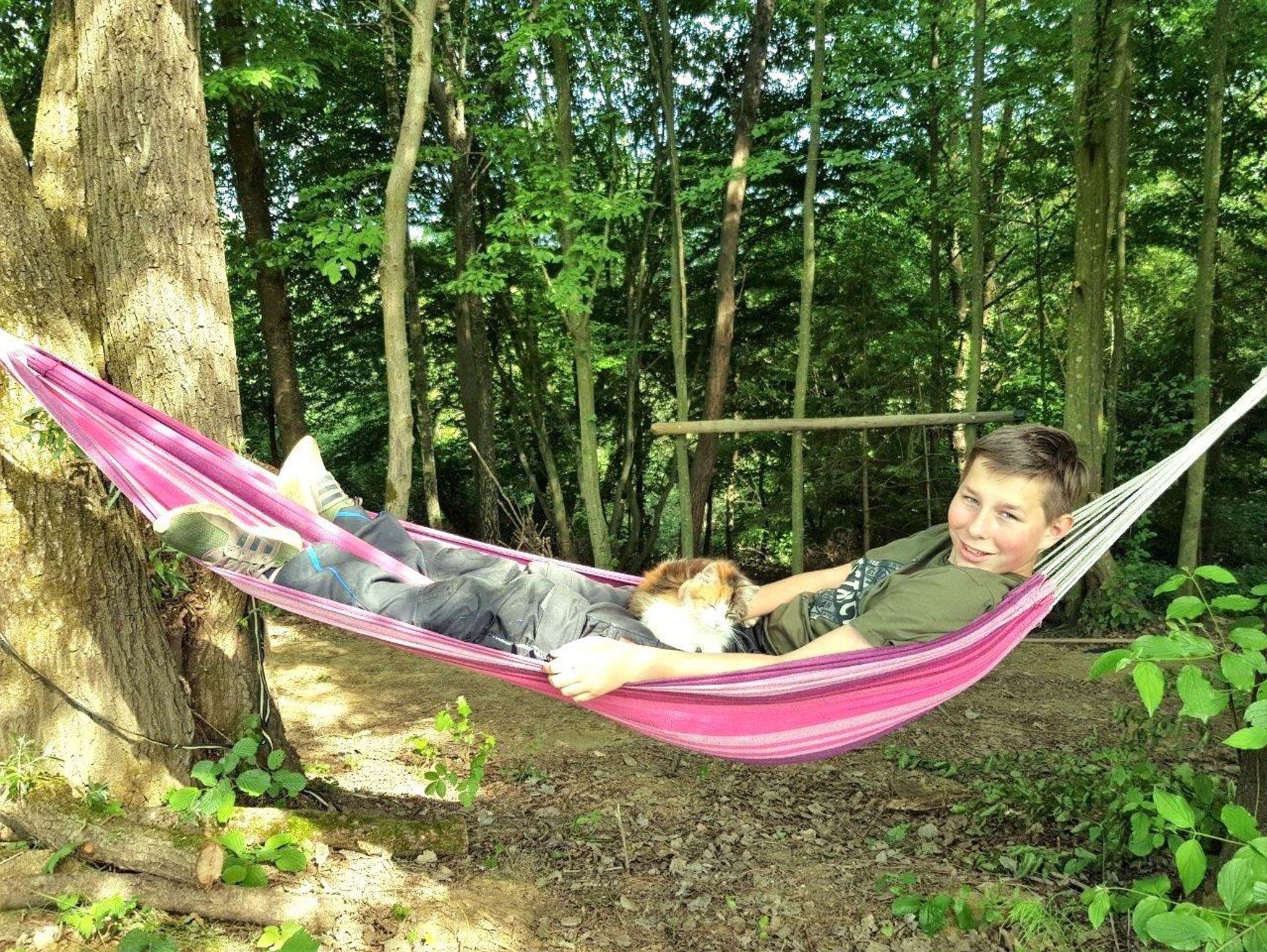 Der angrenzende kleine Wald bietet Entspannung pur beim Waldbaden. Am Waldesrand erfreuen sich Kinder am Trampolin, beim Sandspielen und Schaukeln.