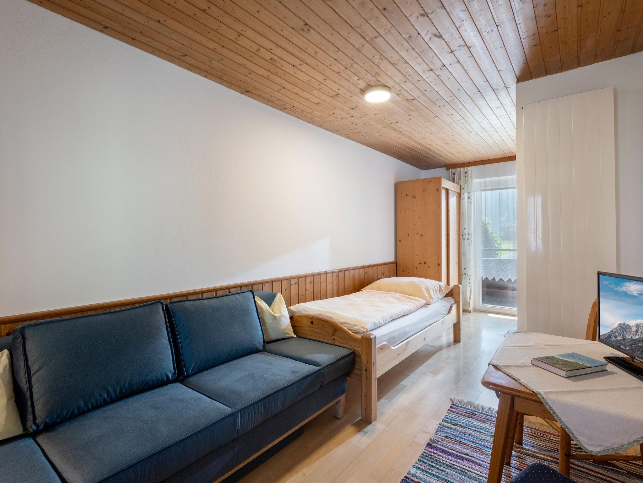 Unsere Ferienwohnung befindet sich im 1. Stock und verfügt über 2 Schlafzimmmer, 2 Bäder, Küche mit Eßecke, Wohnzimmer mit Ausziehsofa für 2 Personen, Sat TV, und Balkon mit Blick in unseren Garten, den Wilden Kaiser und das Kitzbühler Horn.