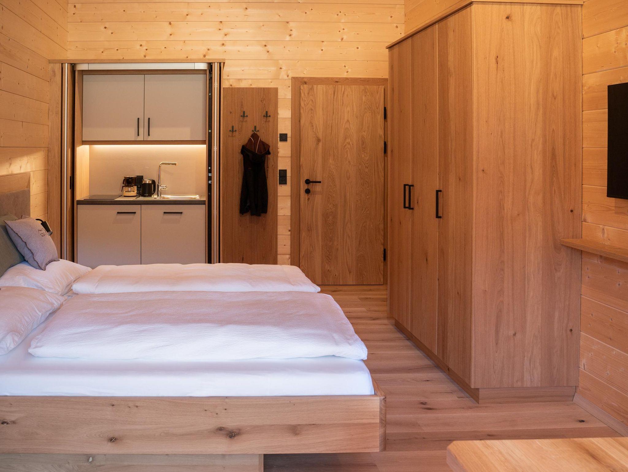 Das modern ausgestattete Studio verfügt über ein Doppelbett (teilbar), eine Essecke mit gemütlicher Bank und Stühlen, eine kleine Küchenzeile sowie einem modernen Badezimmer mit Dusche & WC. Vom Balkon aus hat man einen herrlichen Blick auf die Bergwelt.