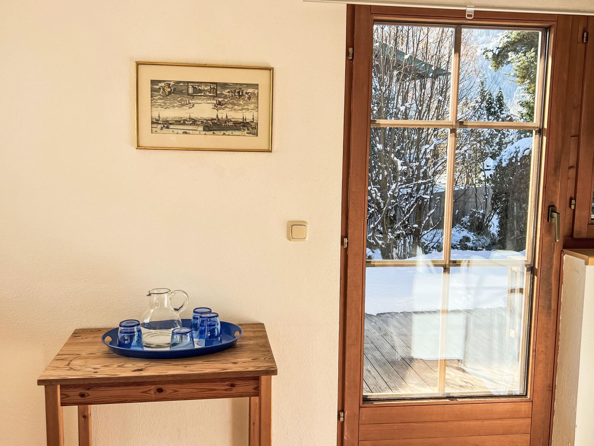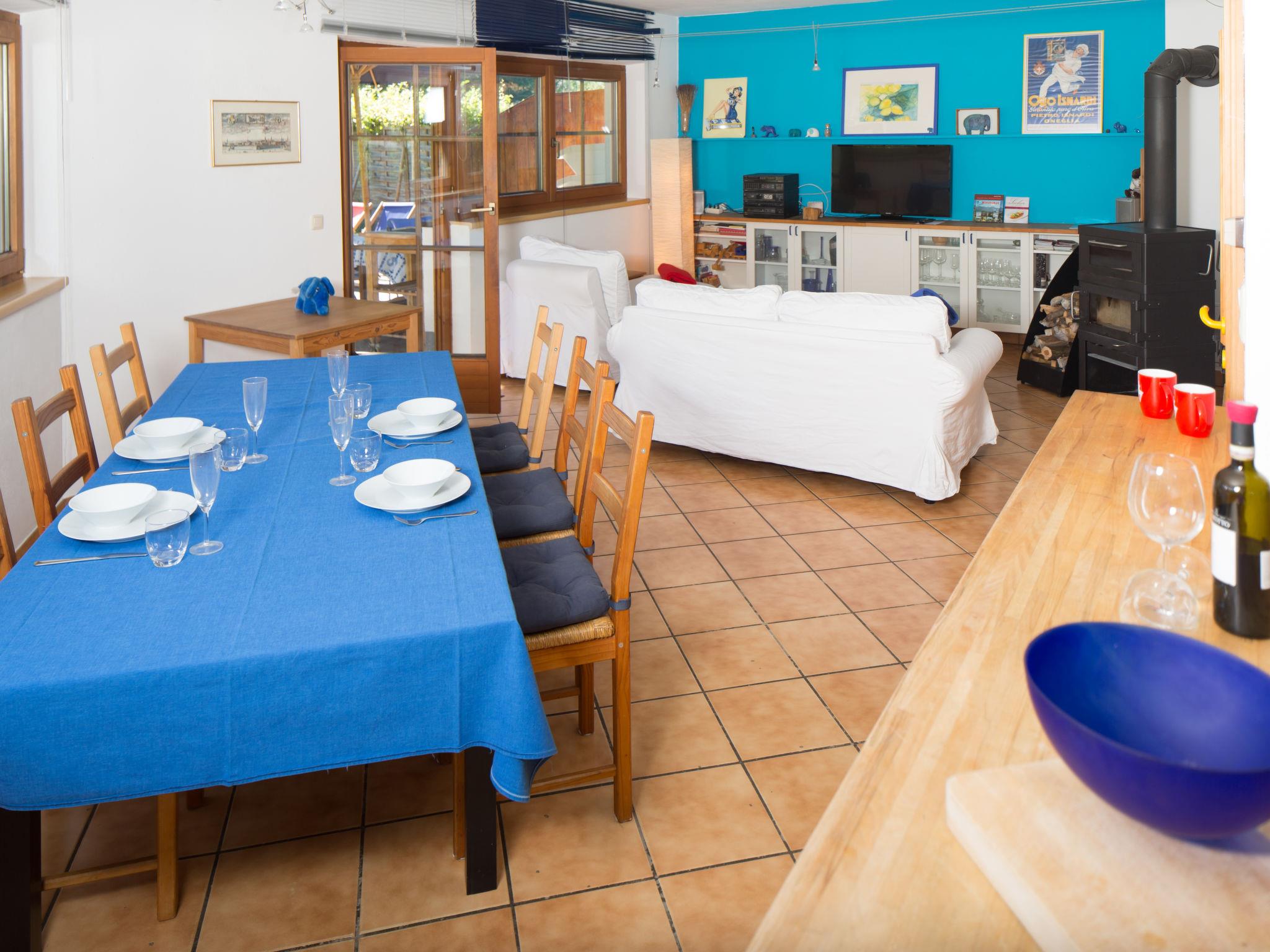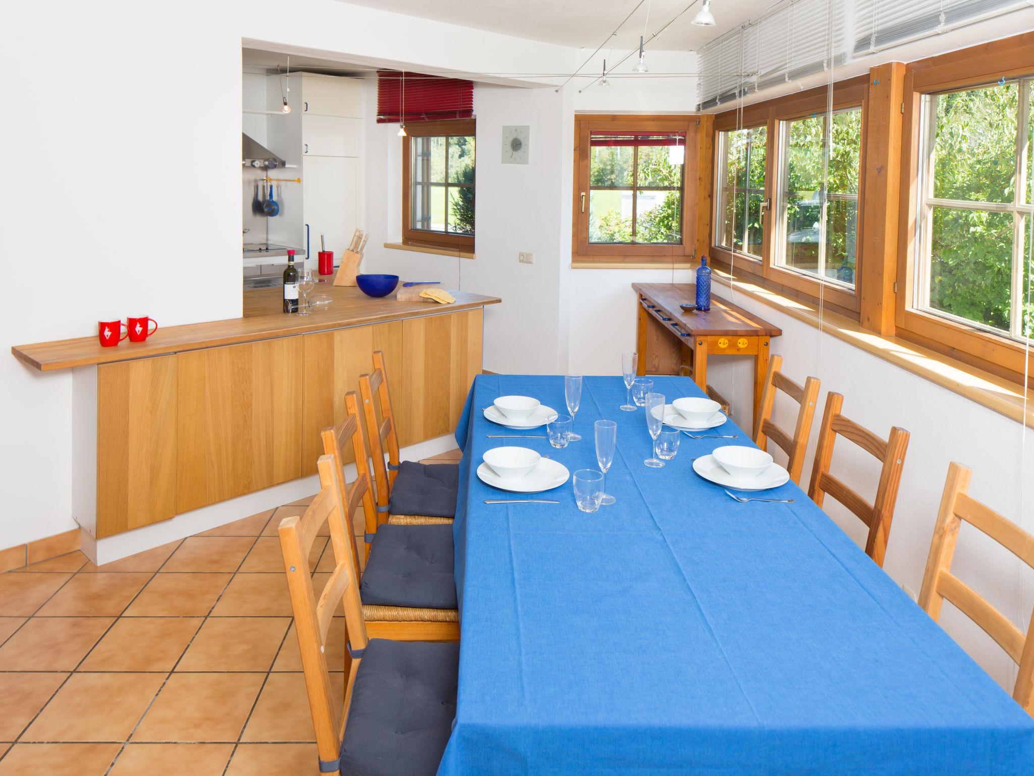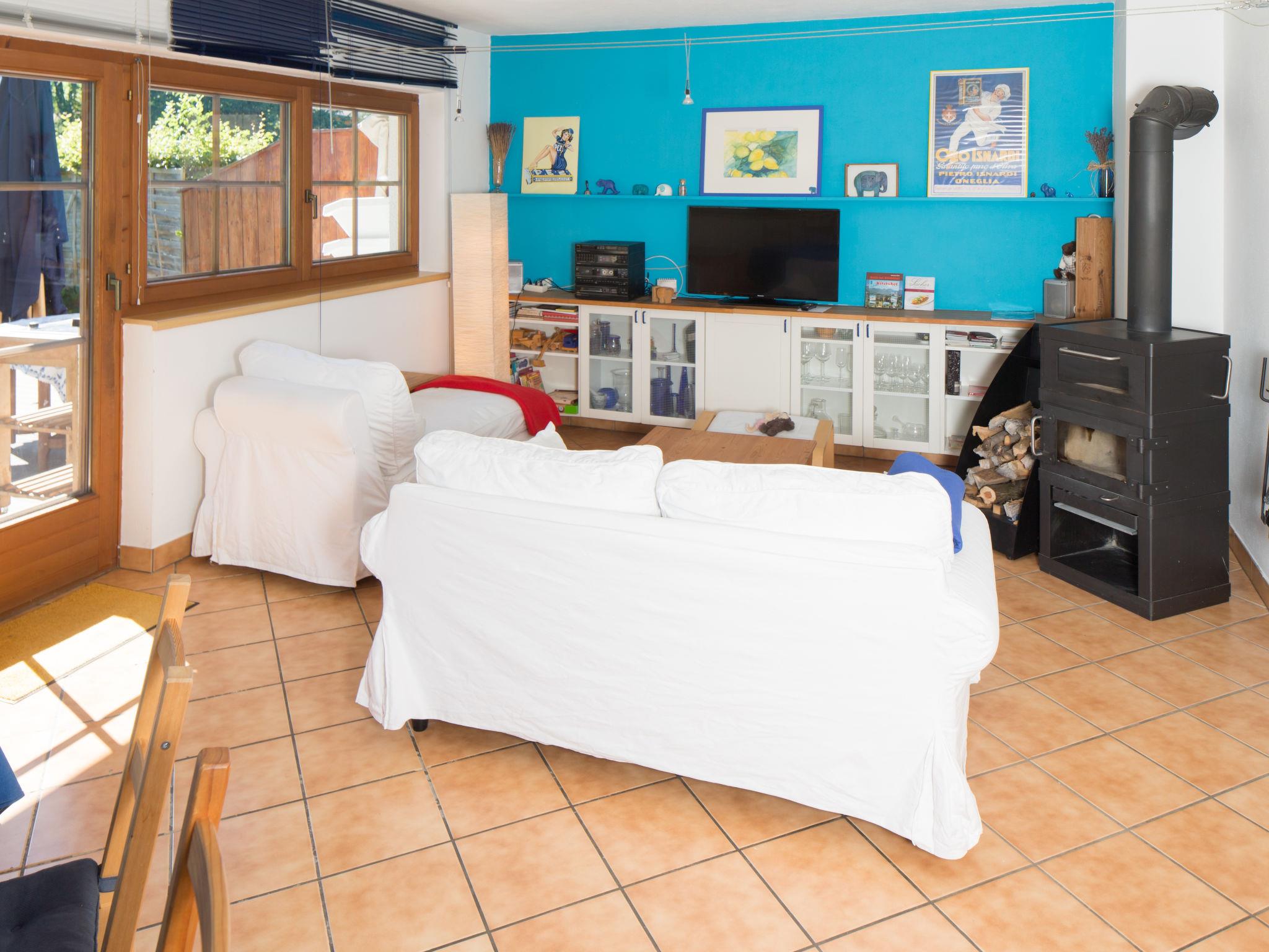 "Blauer Elefant", 4-room apartment 108 m2, on the ground floor. Tasteful furnishings: living room with Scandinavian wood stove and TV. 1 double bedroom with shower/WC and TV. 1 room with 1 x 2 bunk beds (90 cm, length 200 cm). 1 room with 1 double bed (130 cm, length 200 cm). Open kitchen (oven, dishwasher, 4 ceramic glass hob hotplates, toaster, kettle, microwave, fondue Set (chinoise)). Bath/WC. Oil heating. Wooden floors. Terrace 50 m2. Terrace furniture, electric barbecue. Very beautiful panoramic view of the mountains. Facilities: washing machine. Internet (WiFi, free). Please note: non-smokers only. Smoke alarm, fire extinguisher.