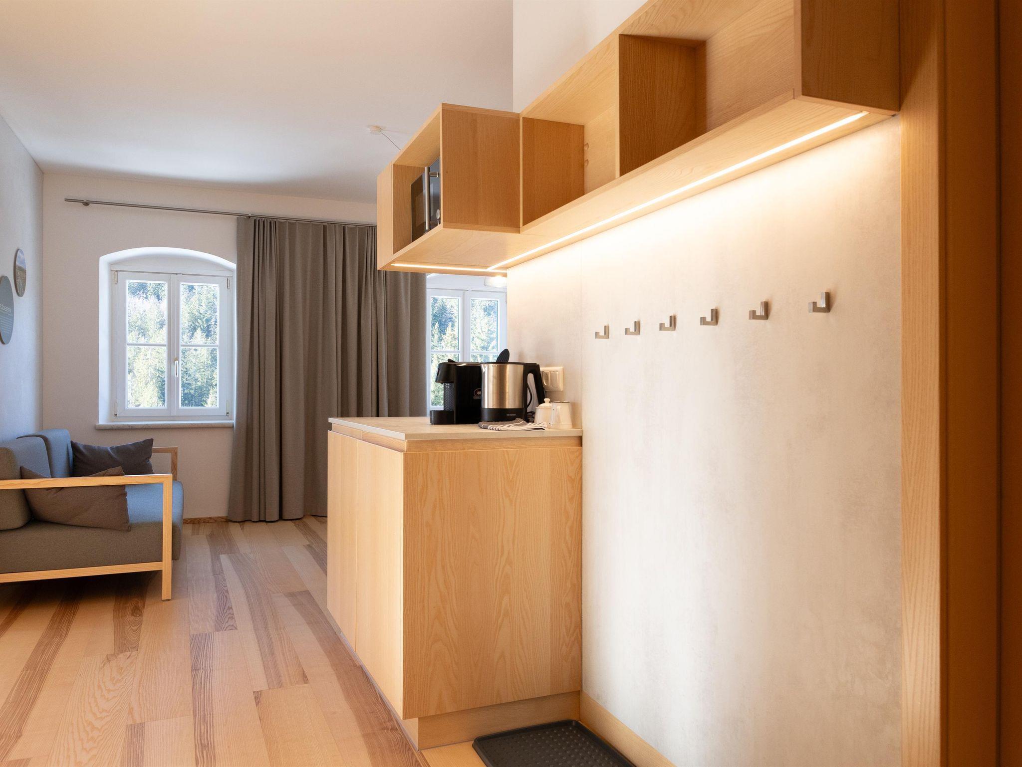 Die Ausstattung der Apartments lässt keine Wünsche offen. In den großzügigen Küchen kannst du dich bequem selbst versorgen, und im Vorraum findest du hausgemachte Gerichte in Kühlschränken, die du in deinem Apartment erwärmen kannst. Außerdem findest du im Kühlschrank in den Appartements einige Erfrischungen, die bereits für dich vorbereitet wurden!