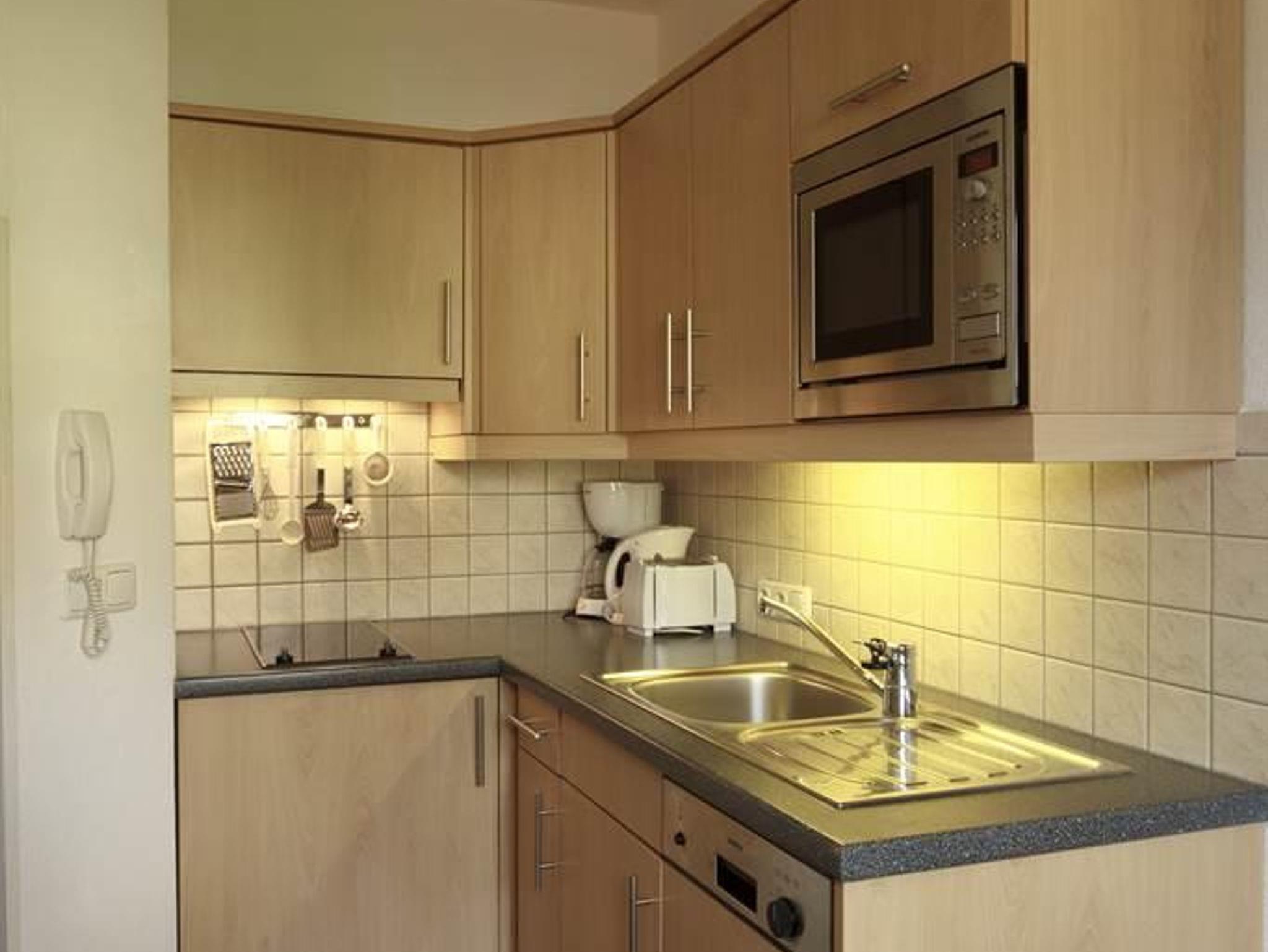 Die Küche ist mit Mikrowelle, Herdplatten, Geschirrspüler, Kühlschrank, Kaffeemaschine, Wasserkocher, komplettem Kochgeschirr ausgestattet.