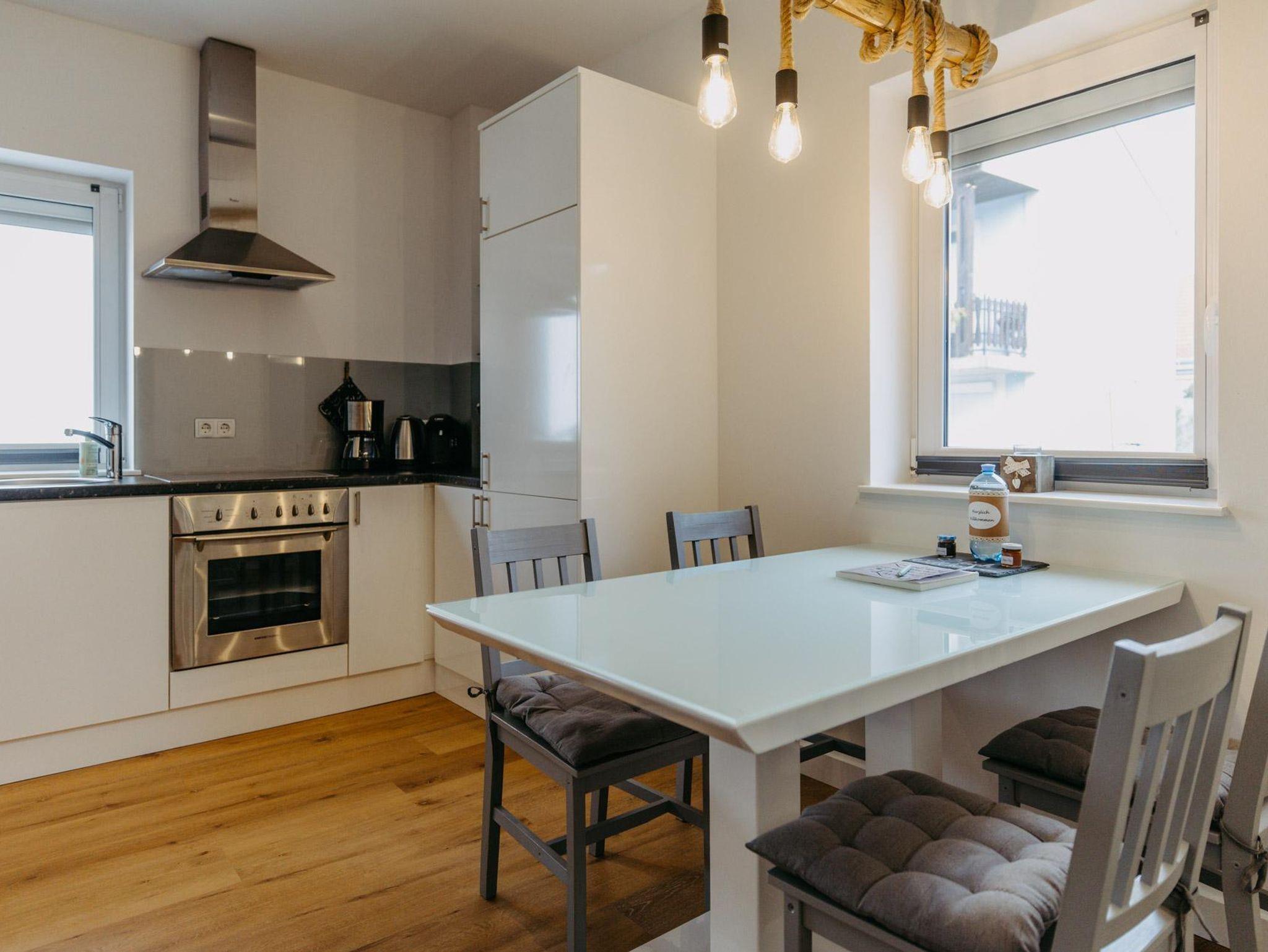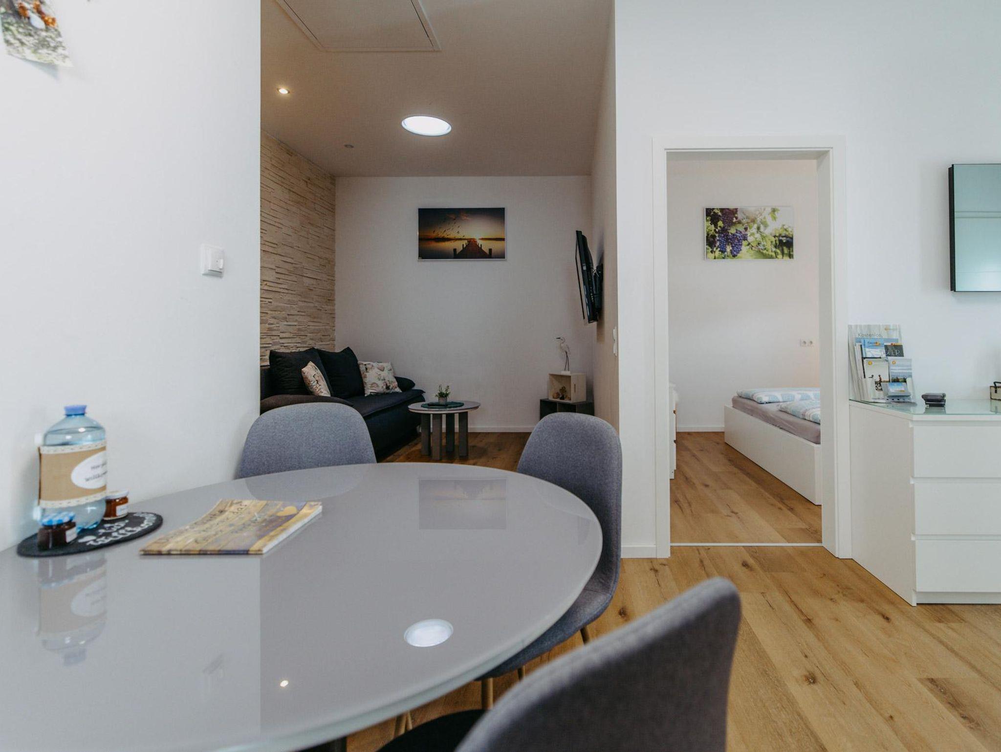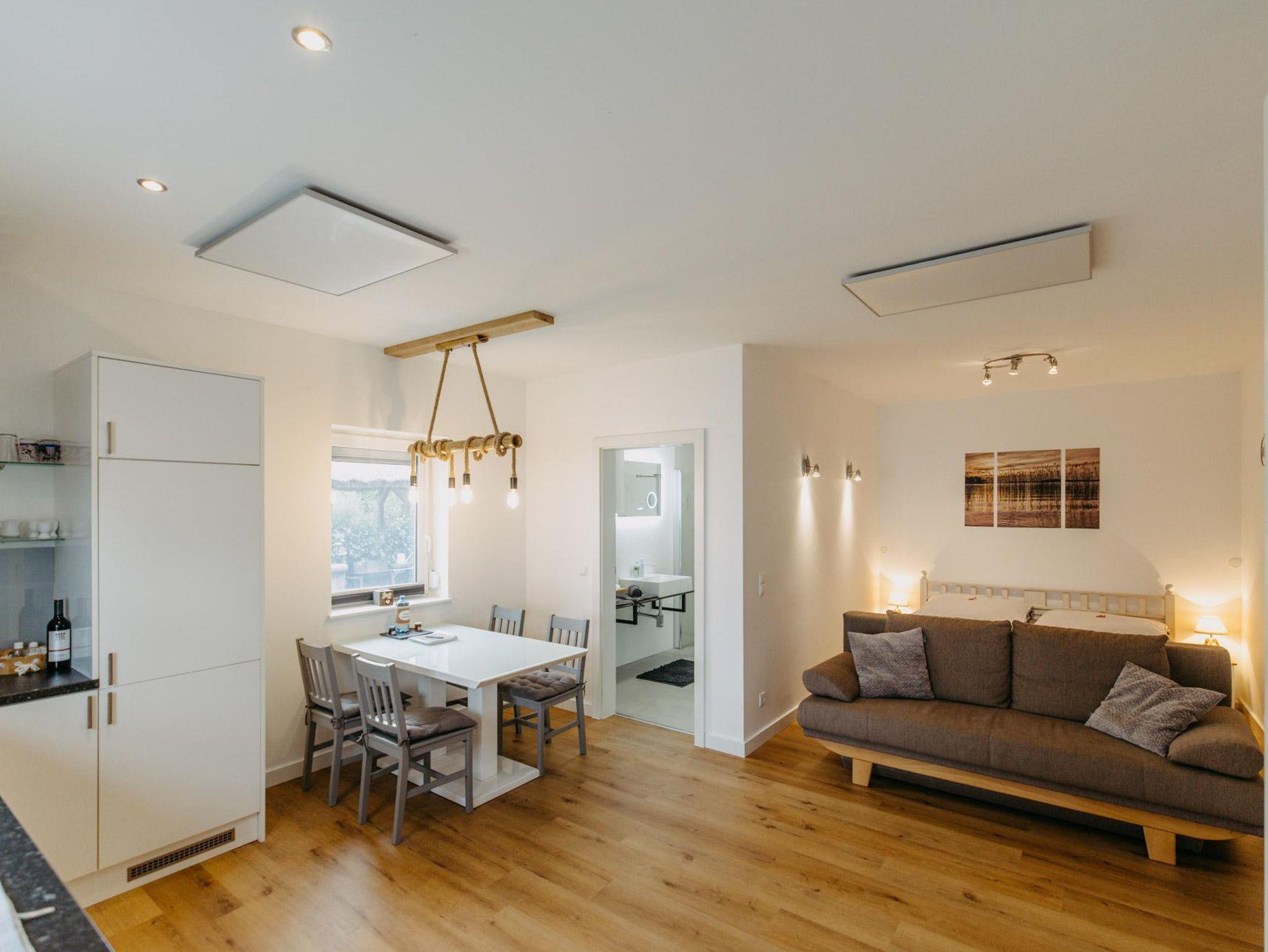 Unsere 45 m² Ferienwohnung Marlena unterteilt sich in einen sehr gemütlichen und mit viel Liebe eingerichteten Wohn-Essbereich. Die erstklassig ausgestattete offene Wohnküche bietet alles für ein gemeinsames Frühstück, Mittag- und Abendessen mit der ganzen Familie. Die Couch kann zum Schlafen von einer Person genutzt werden, aber auch ausgezogen für zwei Personen. Der große Flat-TV und das kostenlose WLAN sorgen für Unterhaltung bei Groß und Klein. Ein separates Schlafzimmer mit Doppelbett lädt zum gemütlichen Schlaf ein. Das modern eingerichtete Badezimmer ist mit WC und Dusche ausgestattet.